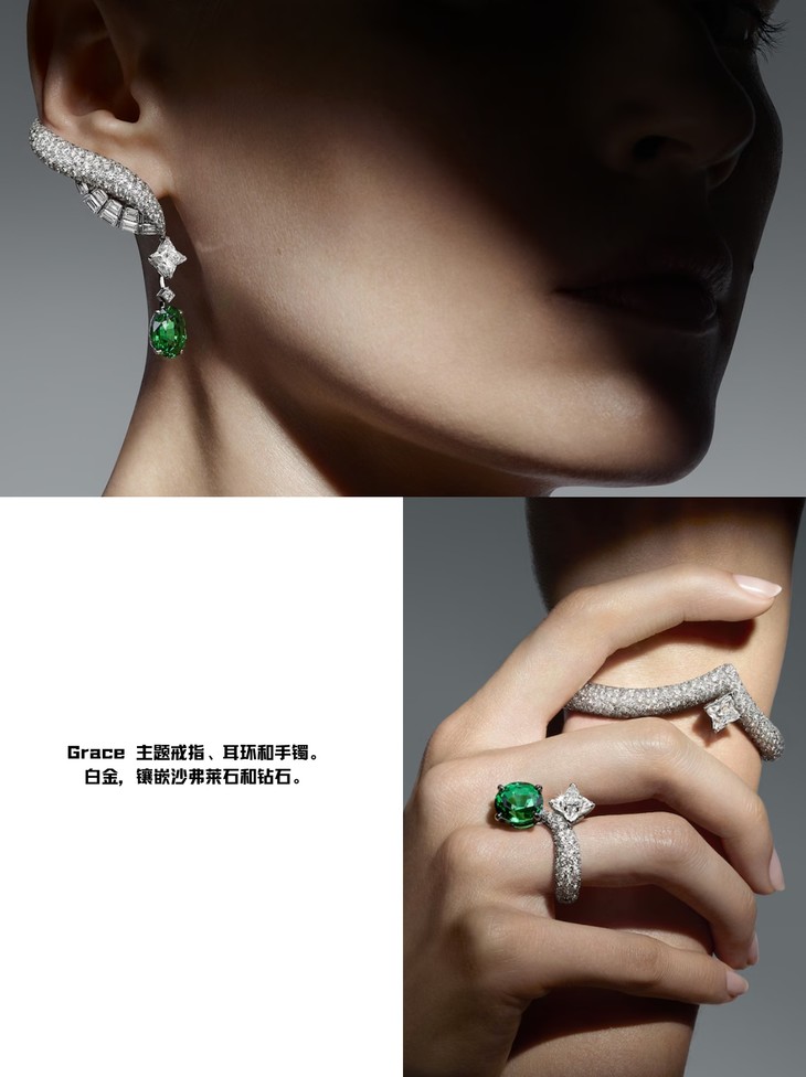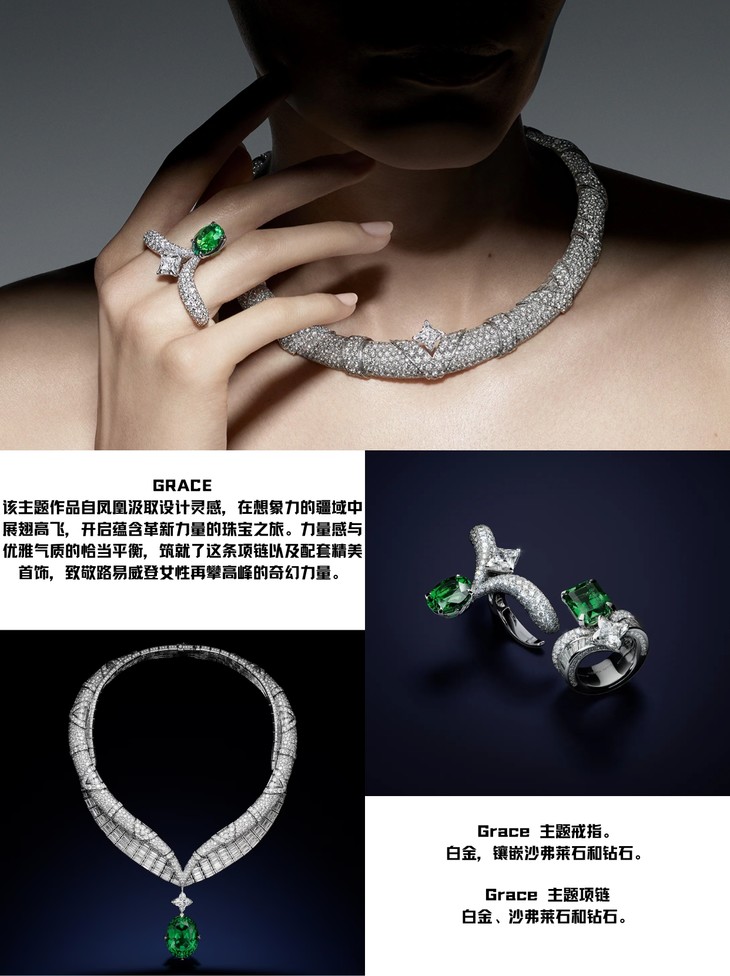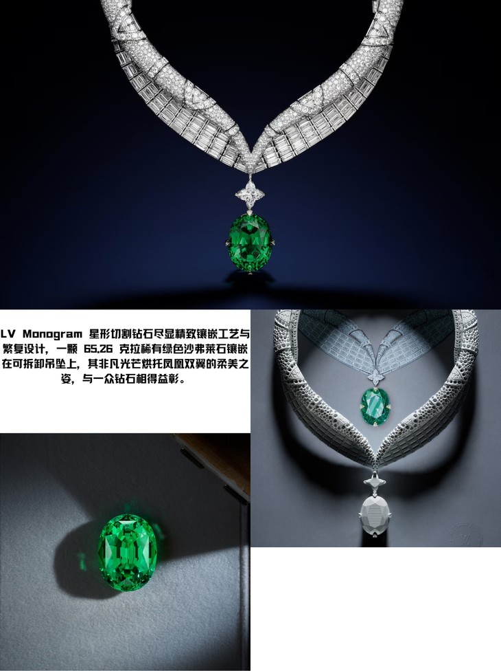 📿而GRACE主题项链,更是以LVMonogram星形切割钻石彰显精致工艺,65.26克拉的稀有绿色沙弗莱石吊坠,犹如凤凰展翅,美得不可方物!👑