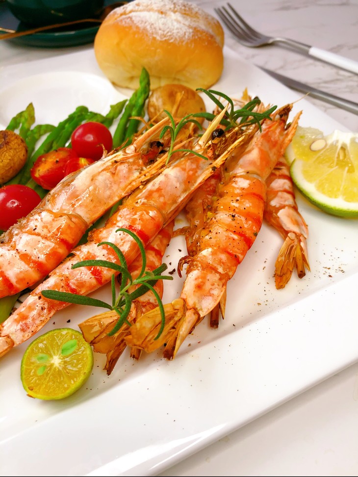 2、芦笋刷少许橄榄油(也可以不刷)、黑虎虾连香料放入东菱空气炸篮,210度15分钟,烤好后挤入柠檬汁即可食用。