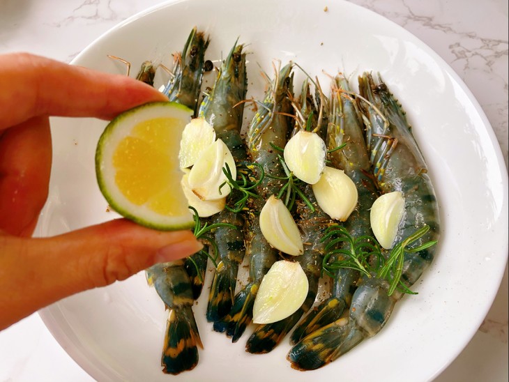 1、黑虎虾解冻去虾线虾肠,清洗干净,用纸巾吸干水分,加入海盐、黑胡椒、香草末、迷迭香、大蒜片和柠檬汁,腌制半小时入味,用一根牙签插在虾中,这样烤出来的虾不会过于弯曲;