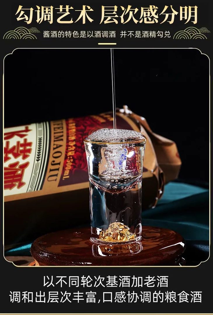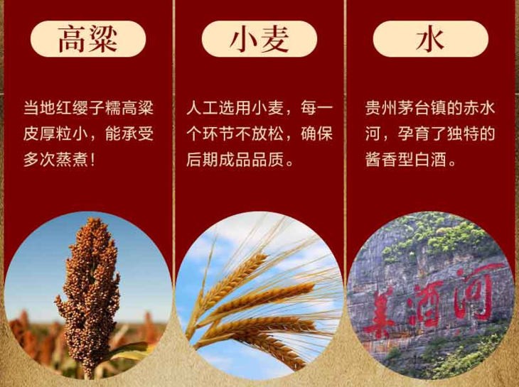 选用茅台镇当地特产的红缨子糯高粱、优质小麦与赤水河水为原料,遵古法酿造工艺而成的稀缺酒体;