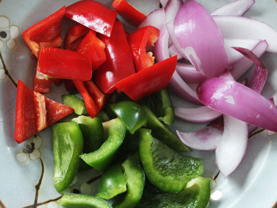 3、青、红椒去筋膜等,然后切成菱形块,洋葱切块;