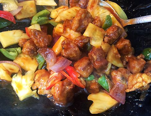 2、重起锅后,放入1小勺油,油微微起烟后,把菠萝放入锅里翻炒,待菠萝变深后放入洋葱块放入煸炒,放入1勺番茄酱(喝汤匙勺),3勺白糖,5勺醋,待糖化开后加入半勺生抽酱油,翻炒到锅里的汁已经光鲜亮丽了,把炸好的肉粒和青、红椒放入翻炒均匀;