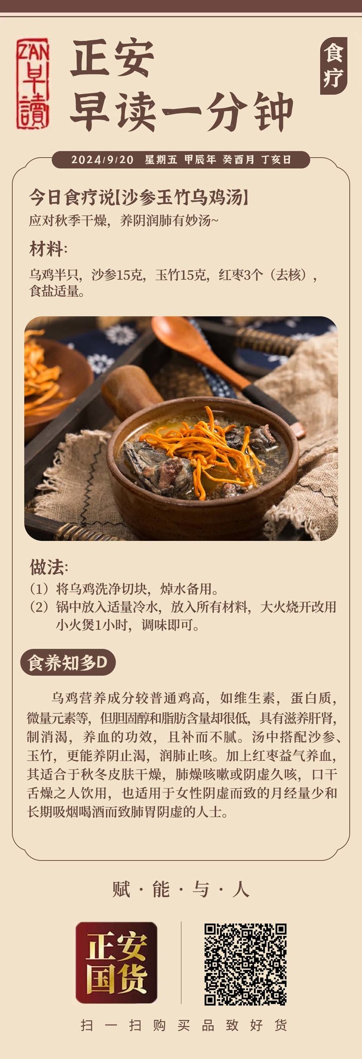 9月20日 应季食方【沙参玉竹乌鸡汤】养阴润燥