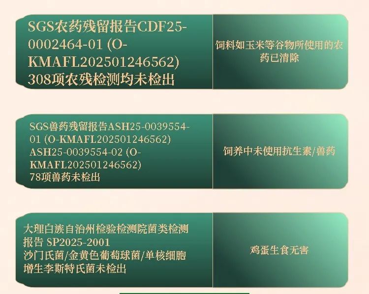 更有SGS农药残留报告、SGS兽药残留报告、大理白族自治州检验检测院菌类检测报告等多项权威检测,308项农残、78项兽药均未检出,沙门氏菌等有害菌也未检出,大家可扫码查看401项完整检测报告,每一项数据都为品质证言。