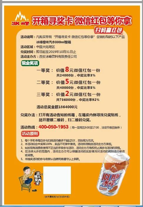 6月至8月,炎炎夏日来临,冰峰以用户为本,在消费终端推出了喝多少送多少活动、3元酸梅汤买三送一活动以及“开心寻奖卡”扫码赢红包等多种活动,有效地增强了冰峰与消费者之间的黏连互动,为消费者创造了更多的体验,影响力进一步扩大。