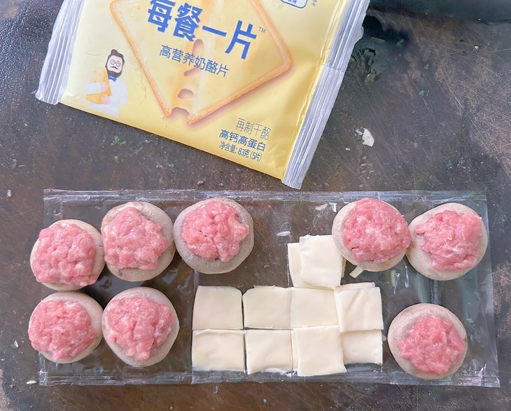2.将白蘑菇去根洗干净后塞入腌好的肉