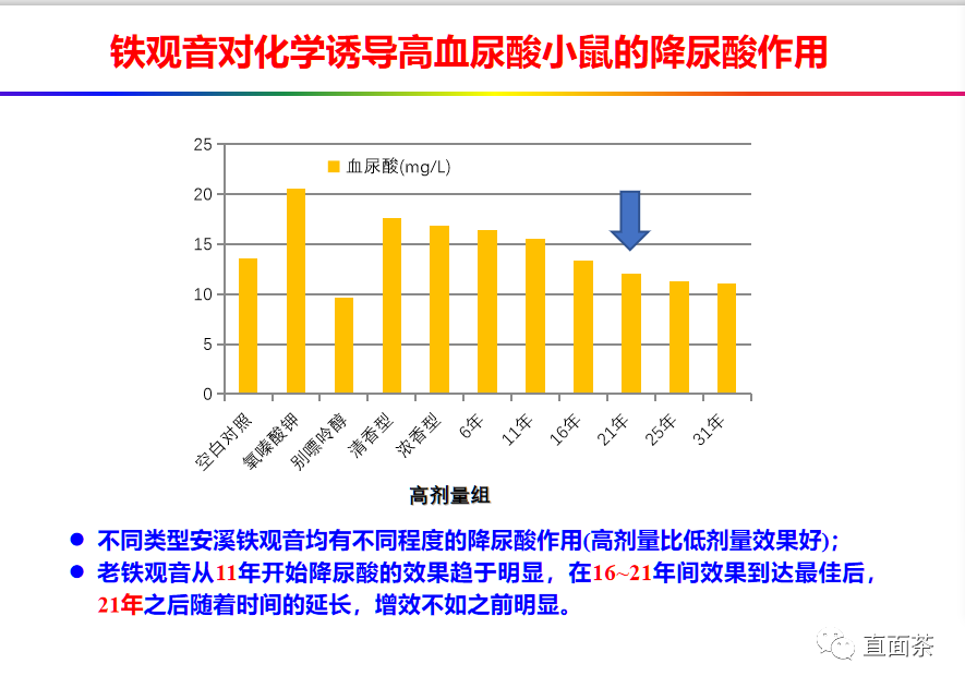 再看看陈年老铁对降尿酸的功效,数据显示11年陈的老铁效果开始显现,16-21年陈的效果最佳,当然,高剂量的效果强于低剂量的效果。