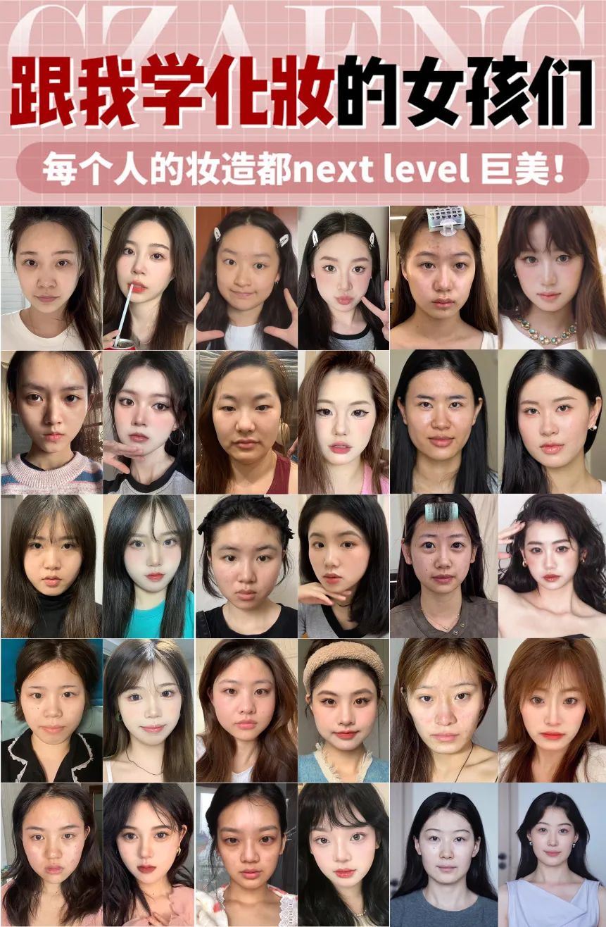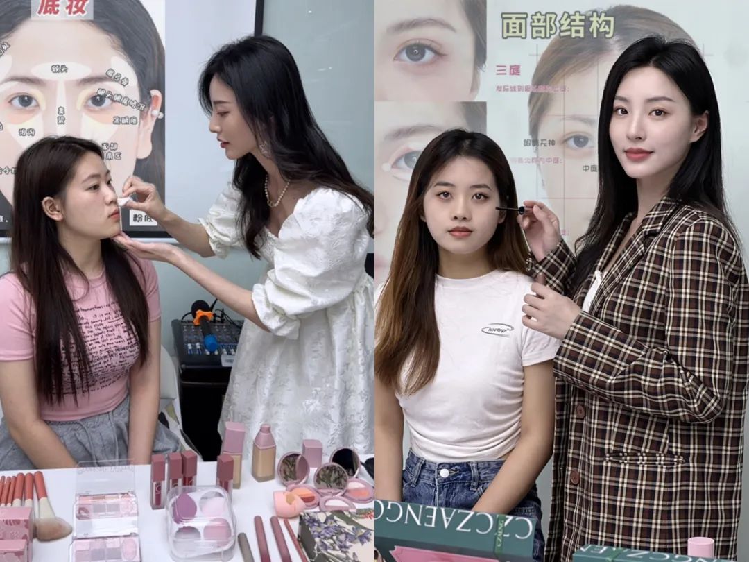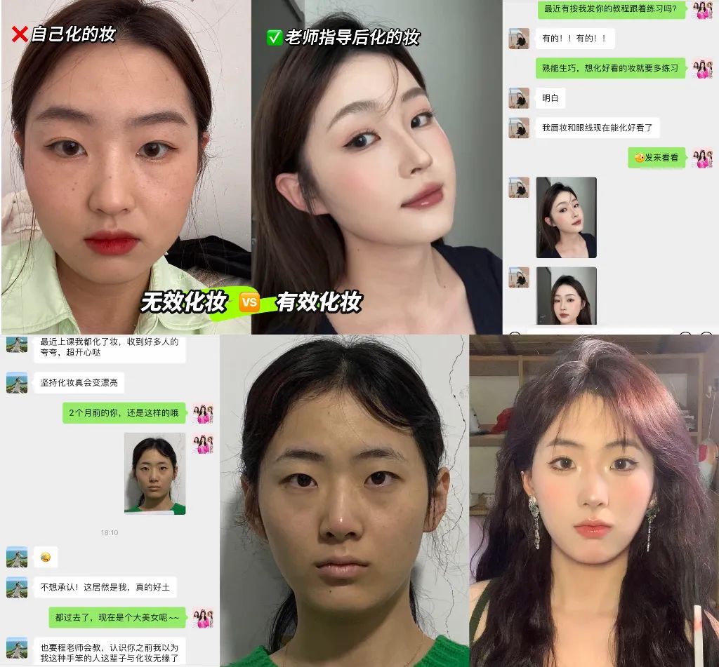 直接抓来身边闺蜜们当「实验田」,开启硬核美妆教学研发,不断修改课程,把一个个专业技法拆解成傻瓜公式:“三明治遮瑕法”、“LOVE腮红画法”、“黄金三点定位画眉法”......