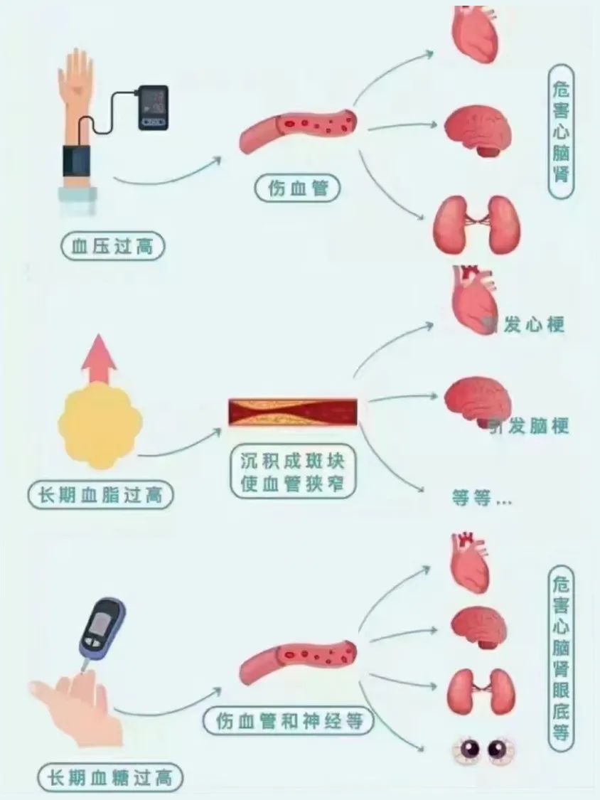 例如咱小区的张大爷,最近就唉声叹气,说自己最近头晕得厉害,去医院一查,血压、血脂、血糖都高。