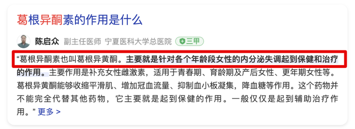 其实还是异黄酮,葛根异黄酮在分子上是跟人体自身分泌的雌激素非常相近的一种物质,属于一种能让女人变得更有女人味儿的物质。