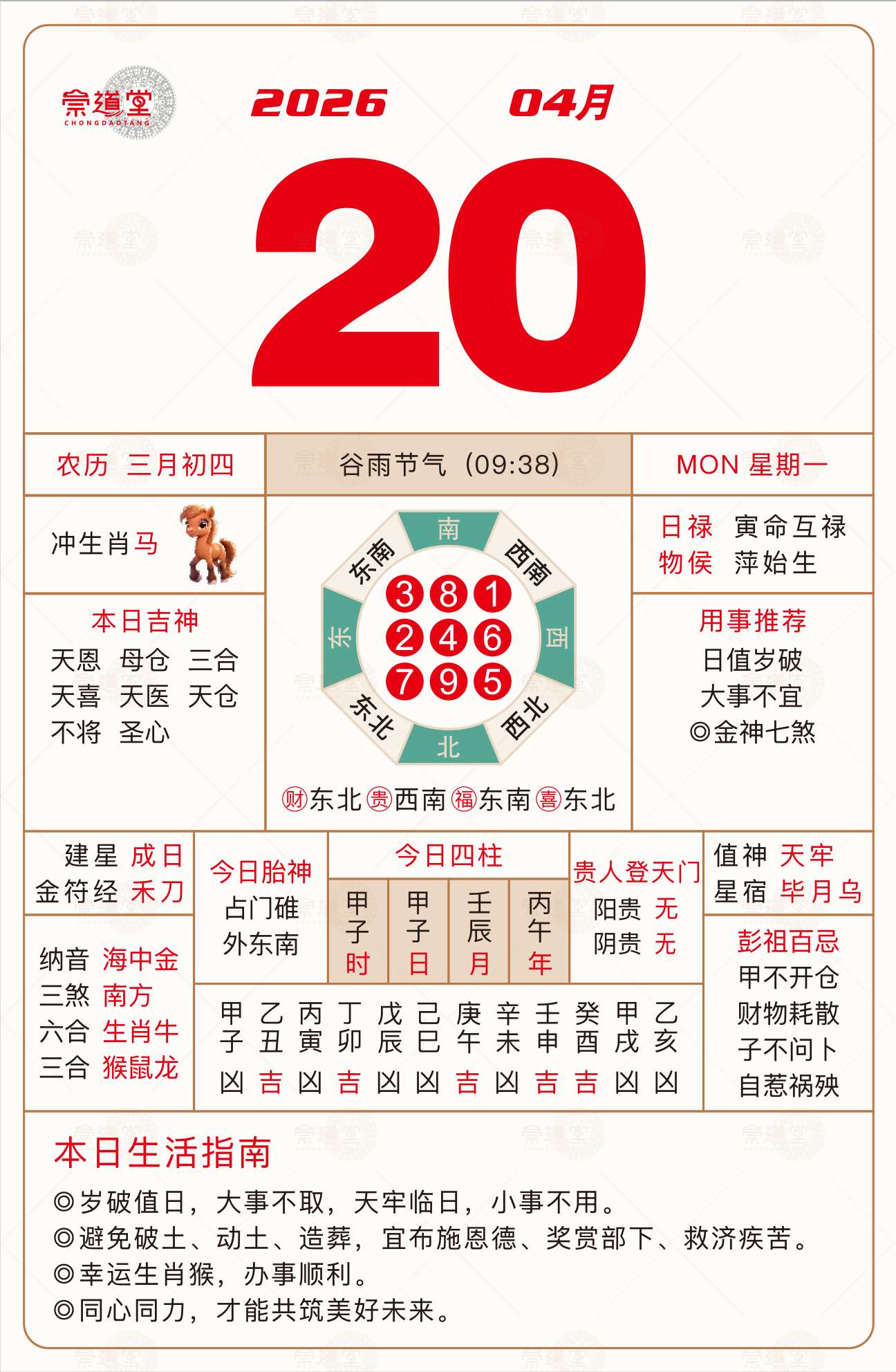 戊午、己未、庚午、辛未等日主,今日宜静不宜动,建议静坐冥想、焚香抄经,尽量心平气和。