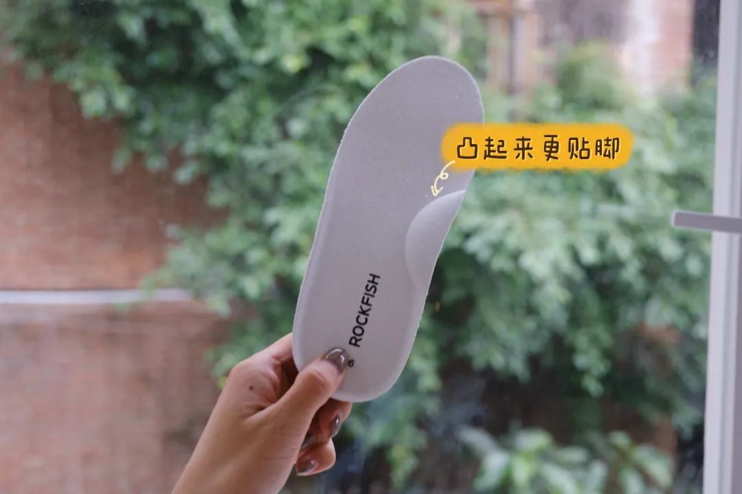 鞋垫设计也很妙。脚底中间有承托足弓,穿起来更加贴合脚型,后跟处慢慢加厚,久穿行走也不会觉得累脚。