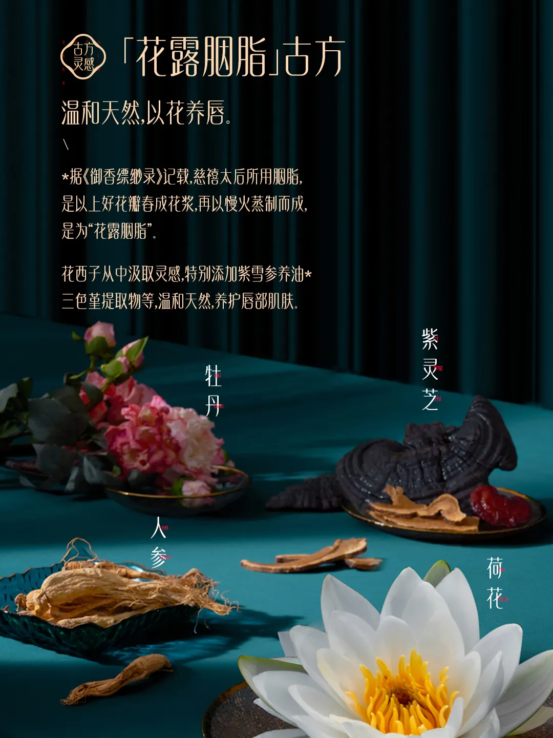 丝绸口红从古方汲取灵感,添加紫雪参养油、三色堇提取物等。