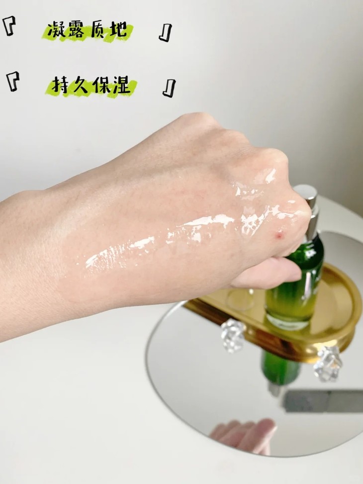 它的质地是很轻薄的透明凝露质地,上脸以后完全不油腻,也很好吸收,还有淡淡的芦荟香气~
