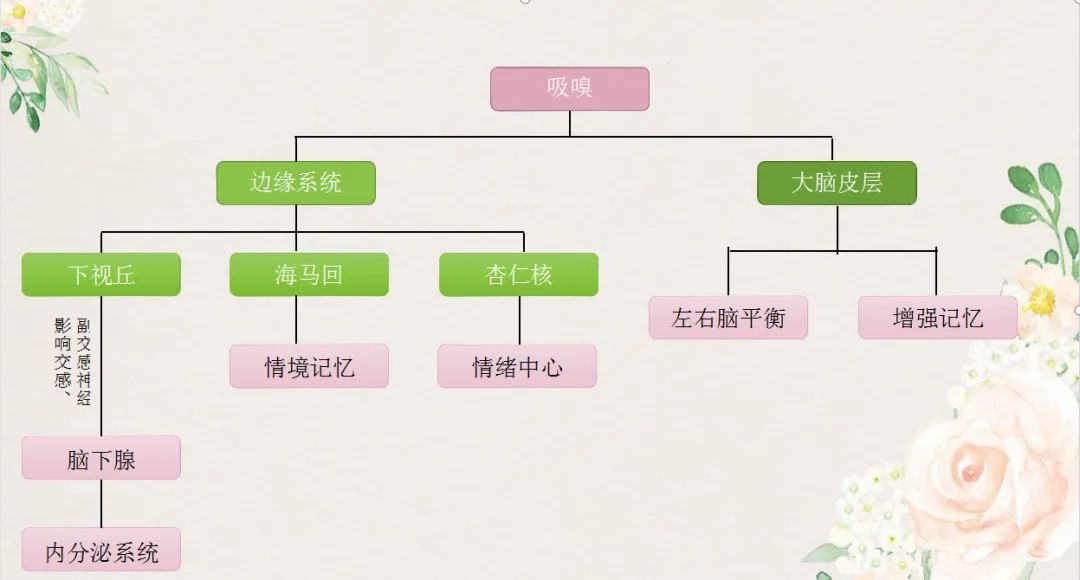 当嗅觉接收器捕捉到了香气分子之后,它就传递给了嗅觉神经细胞,而这个嗅觉神经我们可以看到它是直抵我们的情绪脑和原始脑的,那作用于我们什么呢?边缘组织、下视丘、脑垂体,对,所以说它可以第一时间影响到我们的中枢神经系统和我们的内分泌系统。