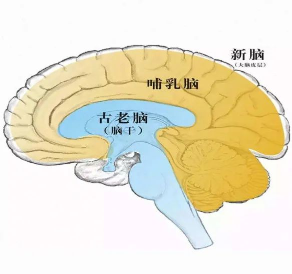 1970年,一位学者把大脑分为这样的三个层级,最内部的我们把它叫做古老脑(也叫原始脑、爬行脑),所有的动物身上都有这一部分脑,它其实就是来操控或指挥我们身体最原始的运行系统的部分。