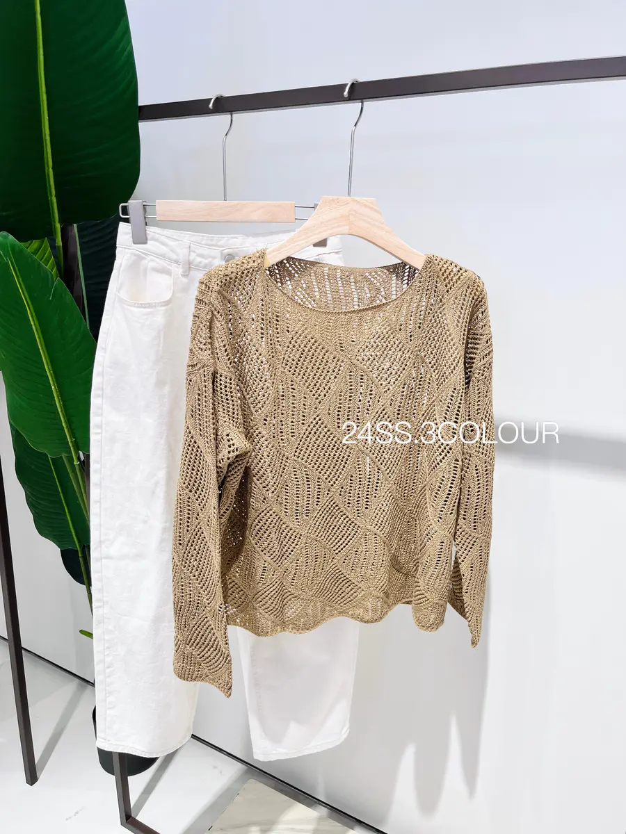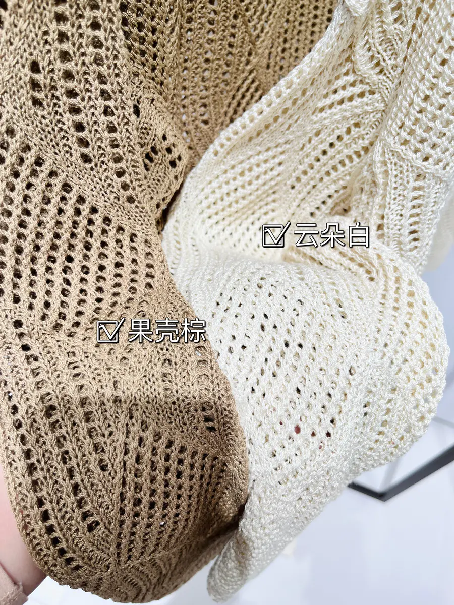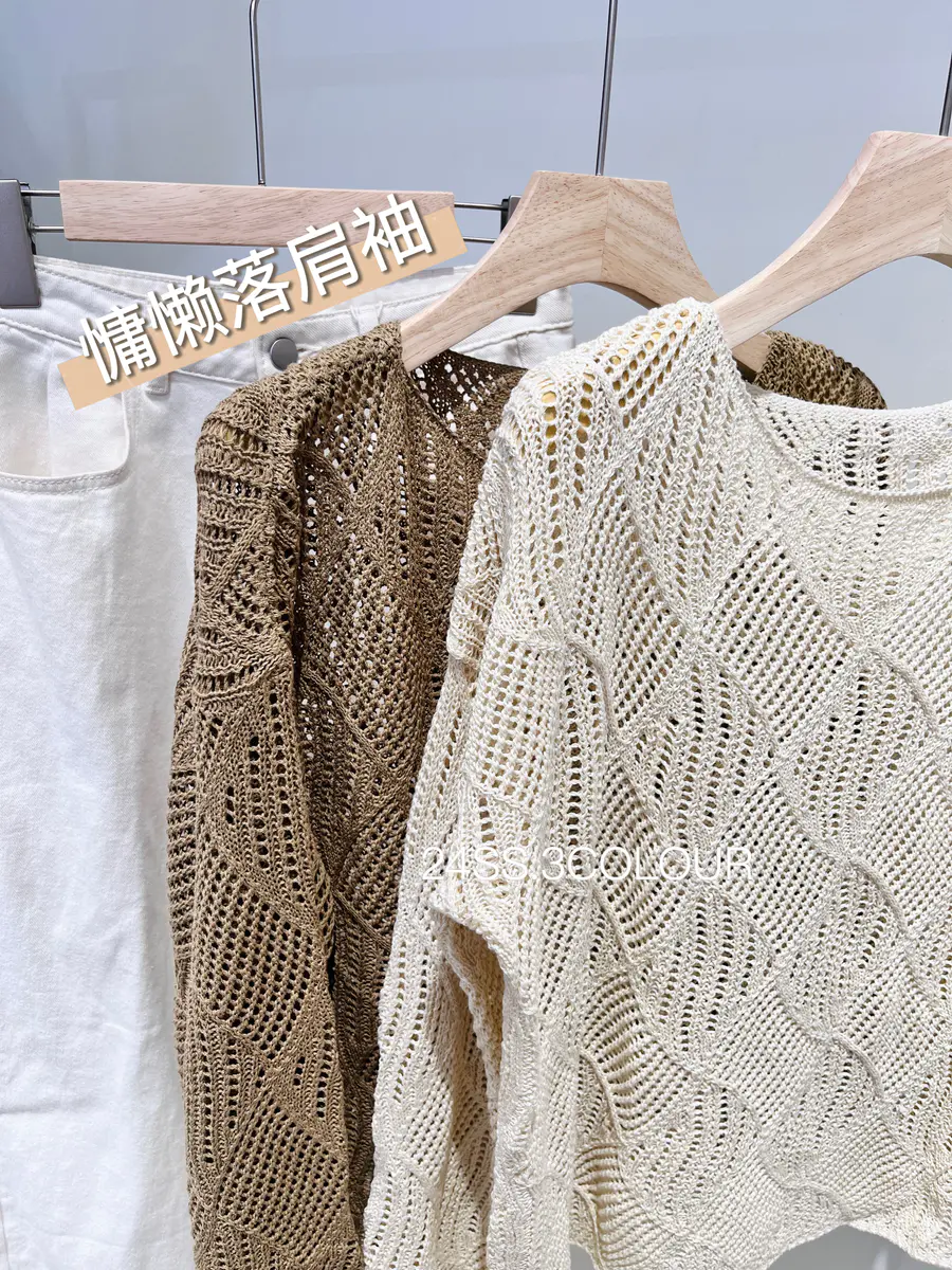 选择了两个比较温柔的颜色,结合菱形镂空织法,以及落肩袖的版型,让整件罩衫都透露出一种度假休闲感,搭配浅色系的裤子或者咖色的单品都是不错的选择;