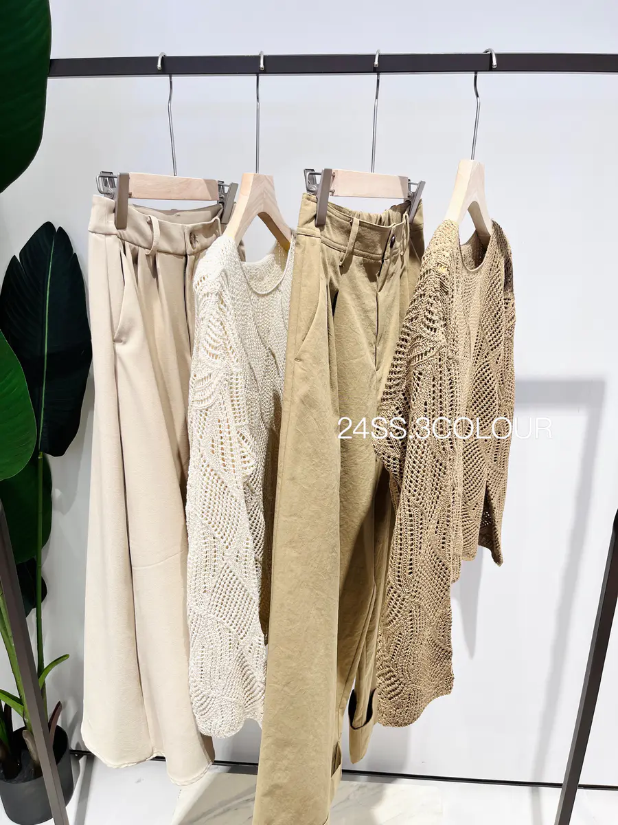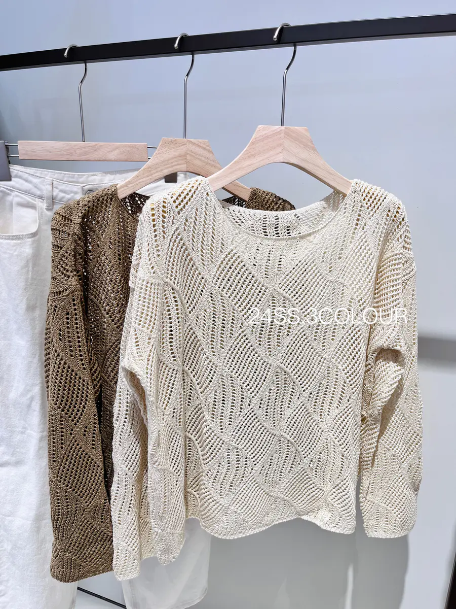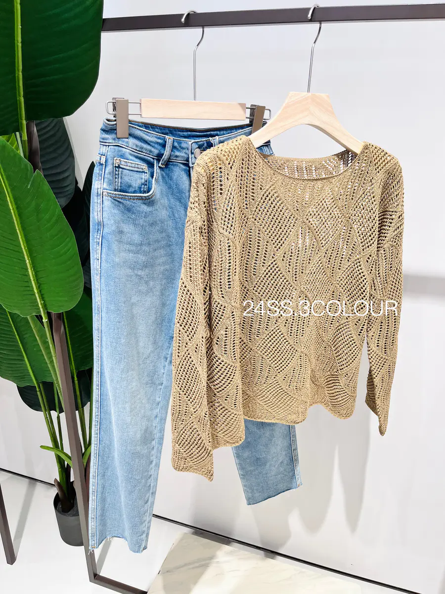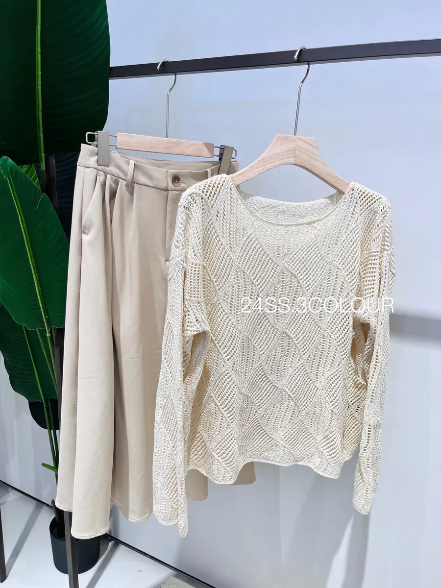 选择了两个比较温柔的颜色,结合菱形镂空织法,以及落肩袖的版型,让整件罩衫都透露出一种度假休闲感,搭配浅色系的裤子或者咖色的单品都是不错的选择;