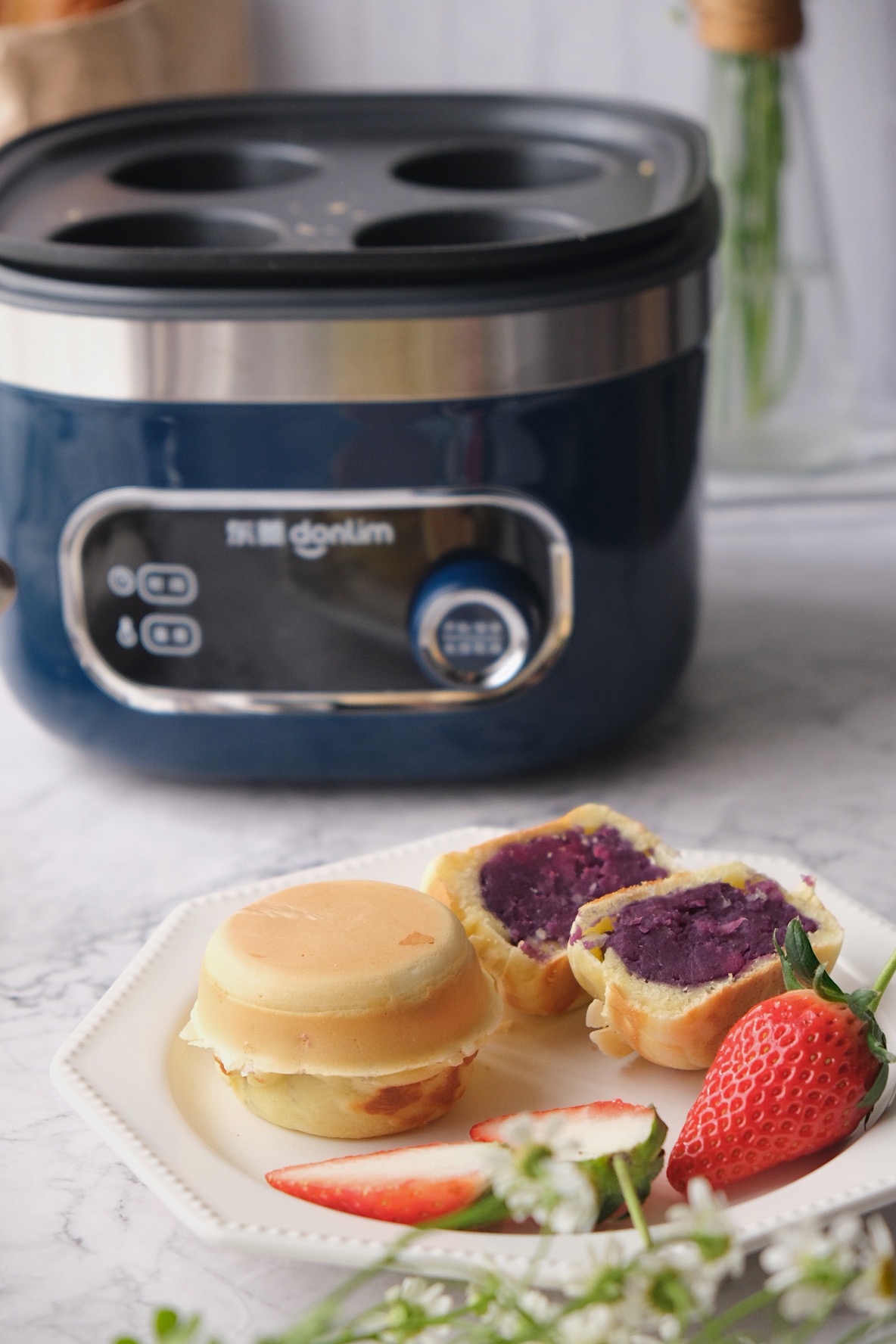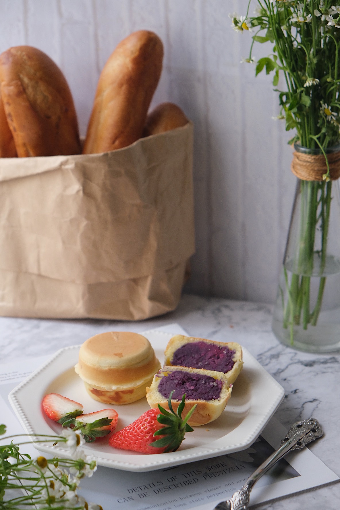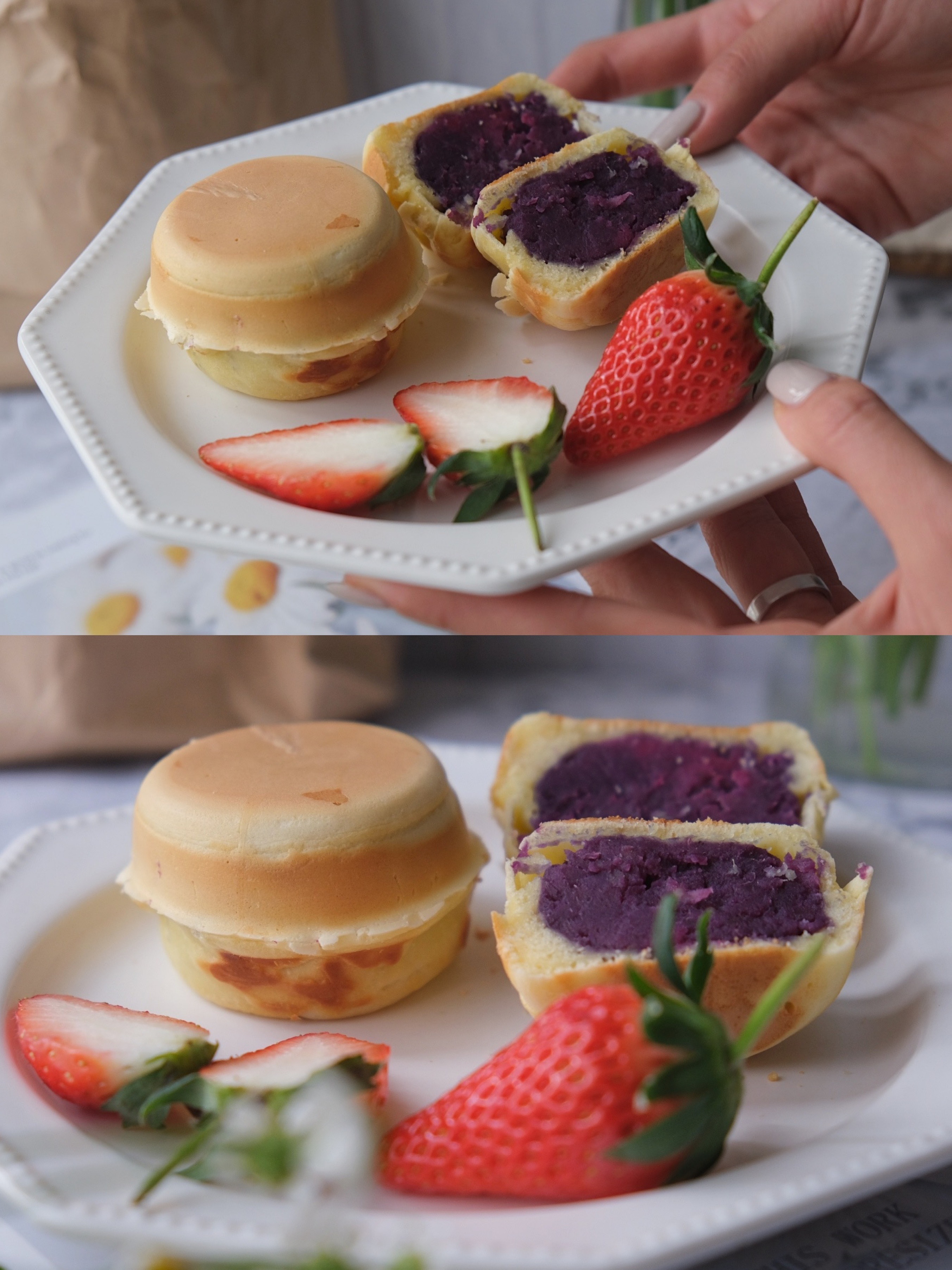 5. 面糊出现小孔后,在两个面糊舀上紫薯泥 [ 不减肥的也可以放一些芝士碎 ] 。