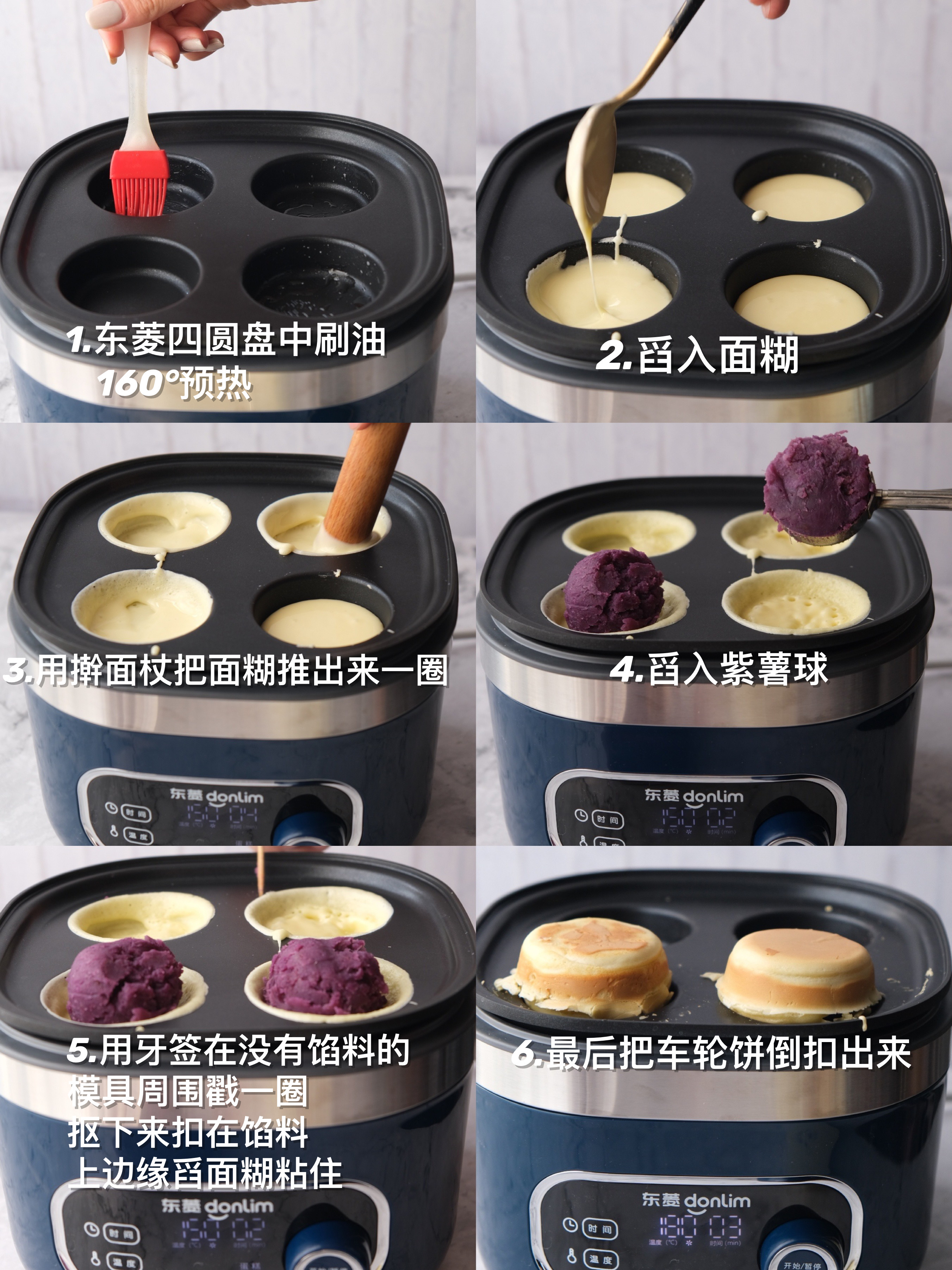 6.用牙签在没有加馅料的模具周围戳一圈,把面糊抠下来后快速扣在馅料上,舀一些面糊把边缘粘住即可,熟了之后把车轮饼倒扣出来就可以了。