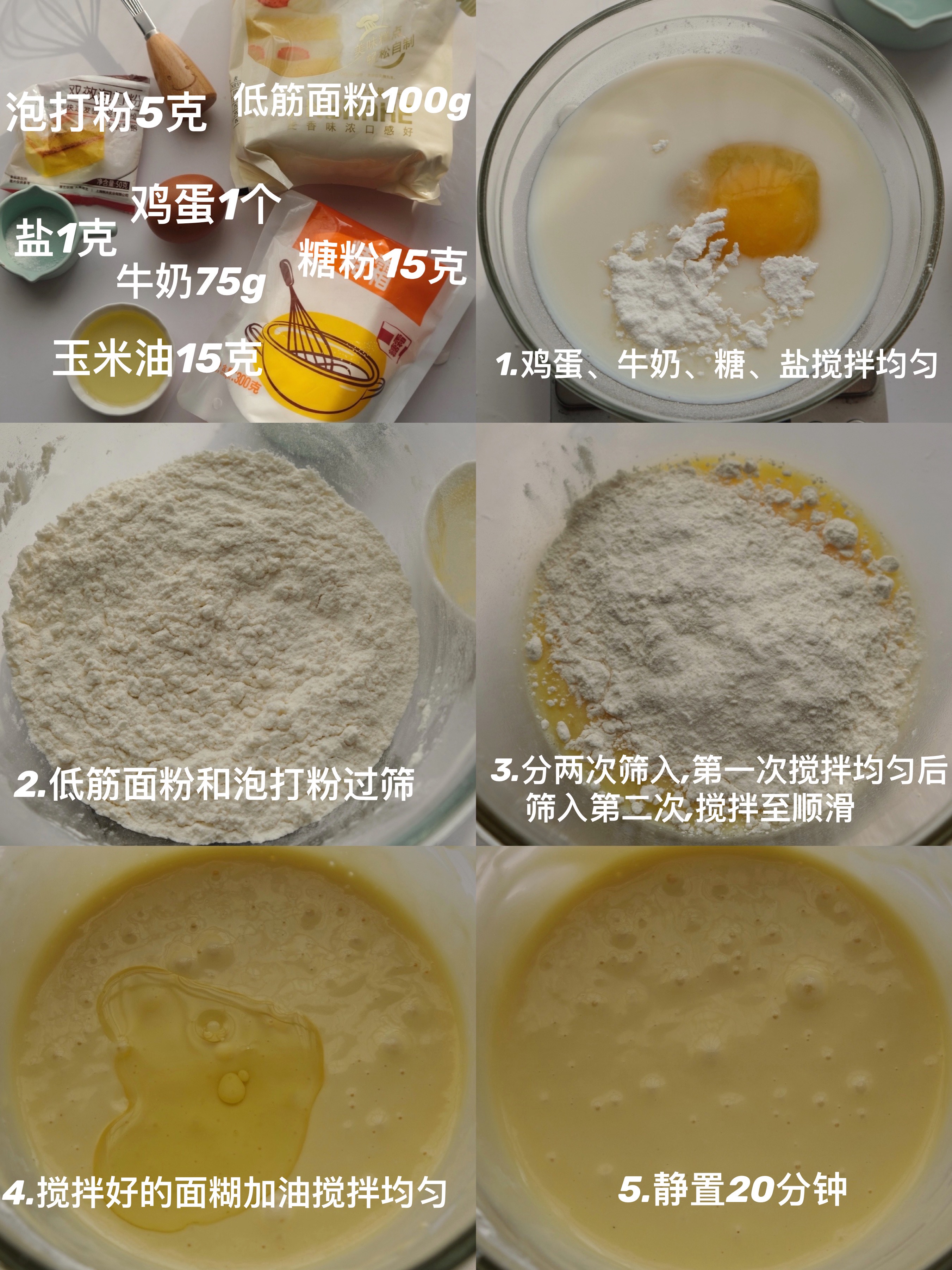 2. 碗中放入鸡蛋、牛奶、糖、盐搅拌均匀,低筋面粉泡打粉混合均匀,分2次筛入,第一次搅到无颗粒状态后筛入第二次,最后搅拌至顺滑即可。