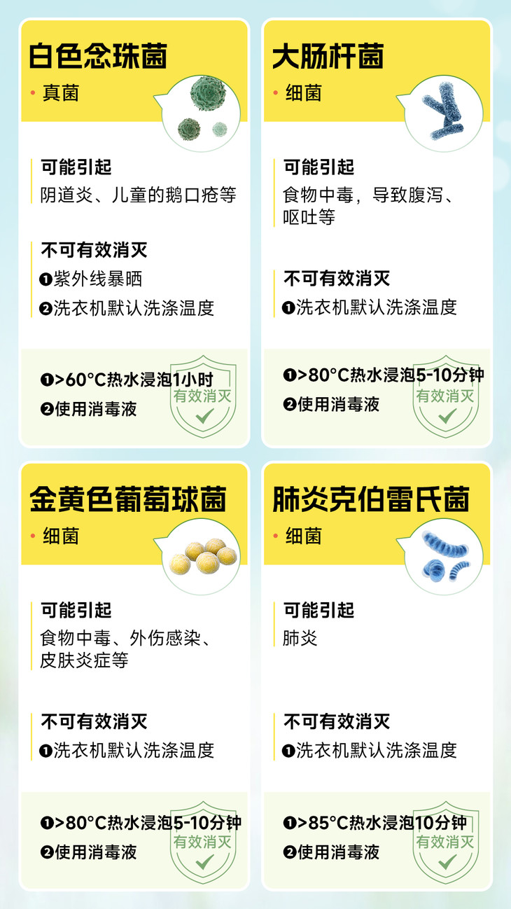 划个重点,不想这些致病菌沾边,太阳暴晒、洗衣机普通洗都不管用,还是得换点别的思路: