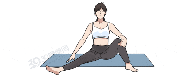 ② 右腿向外舒展,左腿外翻,确保脚后跟朝内。在舒适范围内尽量增大双腿夹角,左手置于左腿膝盖,右手轻触地面。