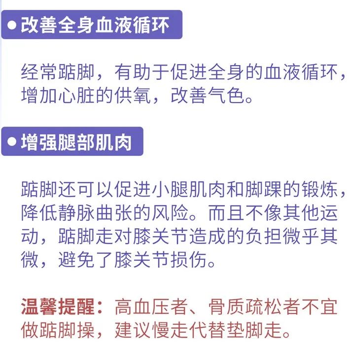 踮脚也称提踵运动,是通过开合脚掌让小腿和脚髁肌腱用力,反复做上下升降运动。