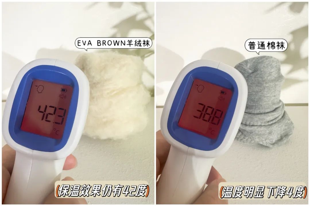 把这款羊毛袜和其他袜子套在42℃左右的热水上,静置5分钟,保温效果一目了然。