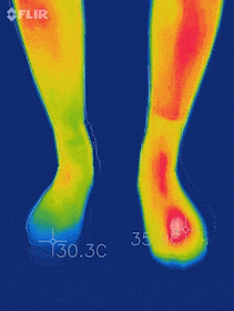 添加发热纤维,在热感成像仪下,左脚穿上直接升温5℃。