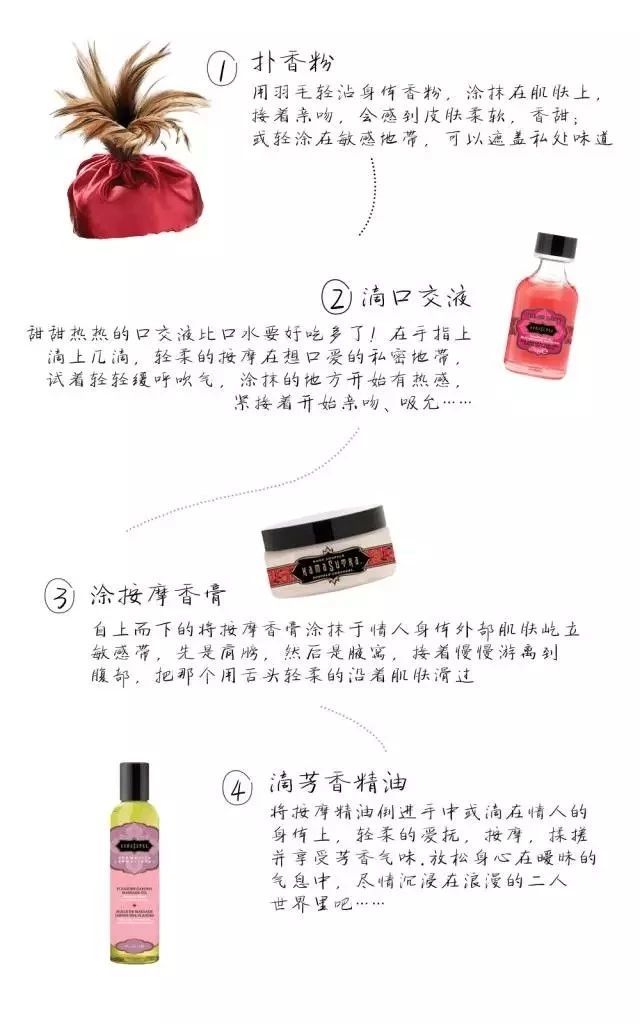 里面有香甜热感口·嗳液;身体软滑香粉+手工羽毛粉扑;按摩香膏;芳香按摩精油。