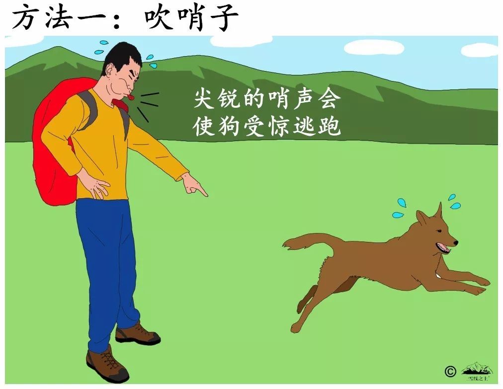 在狗扑向你时,用力吹响求生哨。狗听到尖锐、刺耳的哨声,大多会因受惊吓而逃跑。
