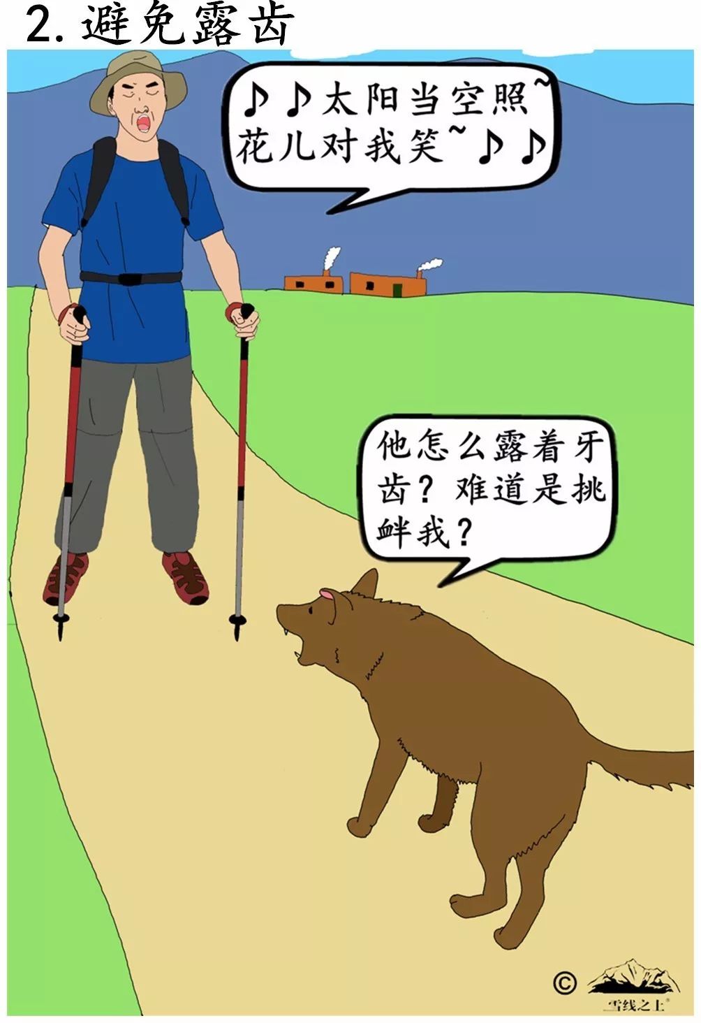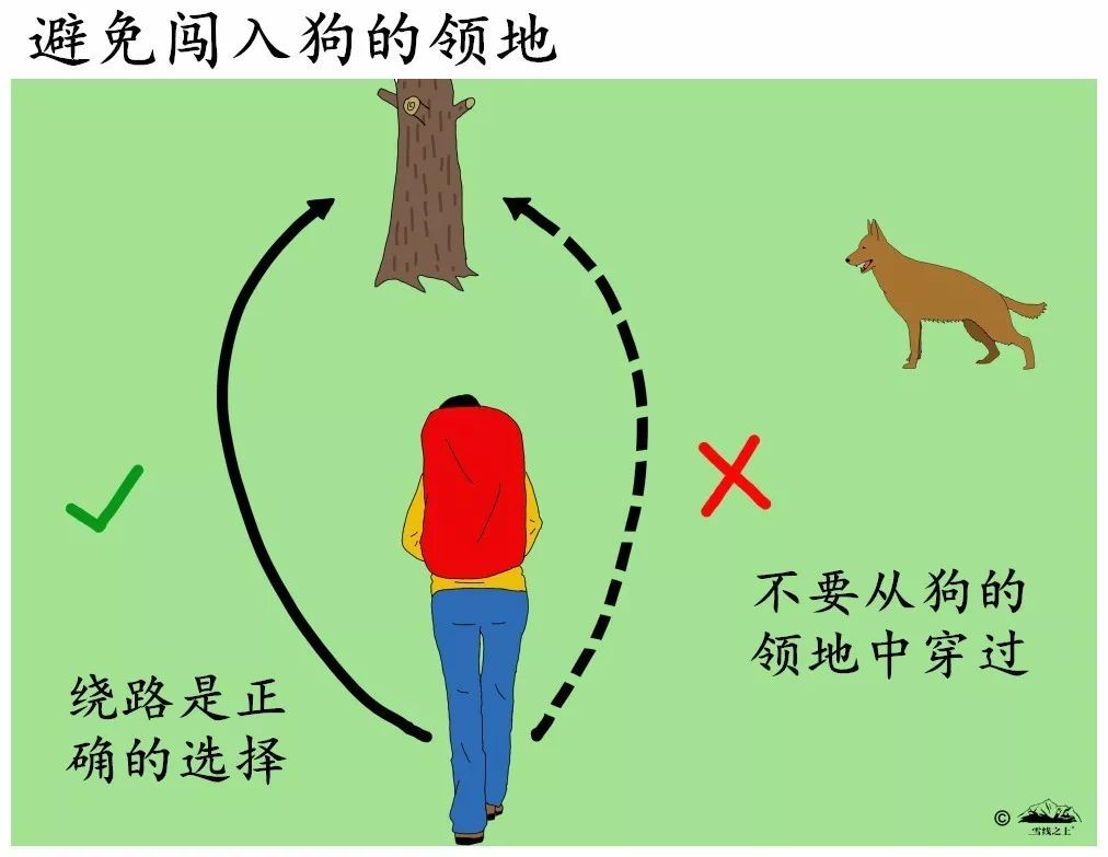 当你在徒步中远远地看到了狗或听到狗叫,此时绕开狗的领地是最正确的做法。遇到狗时不要主动挑逗或攻击。