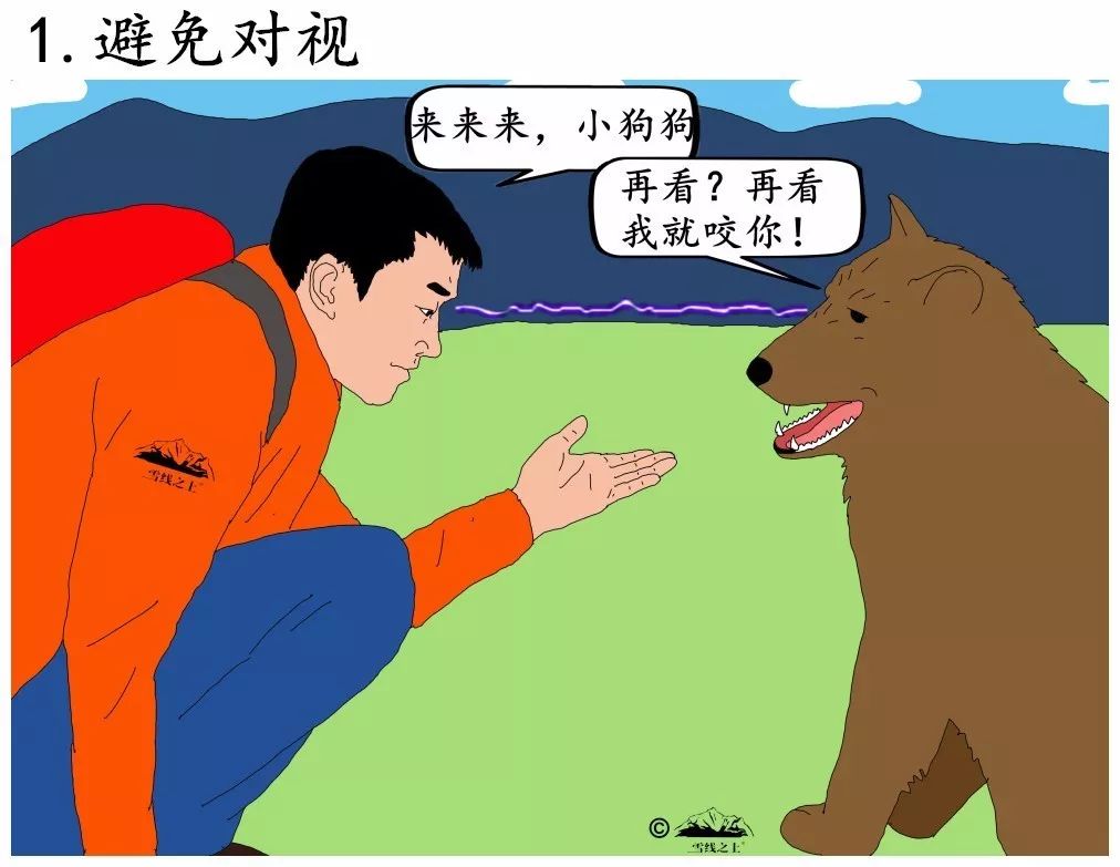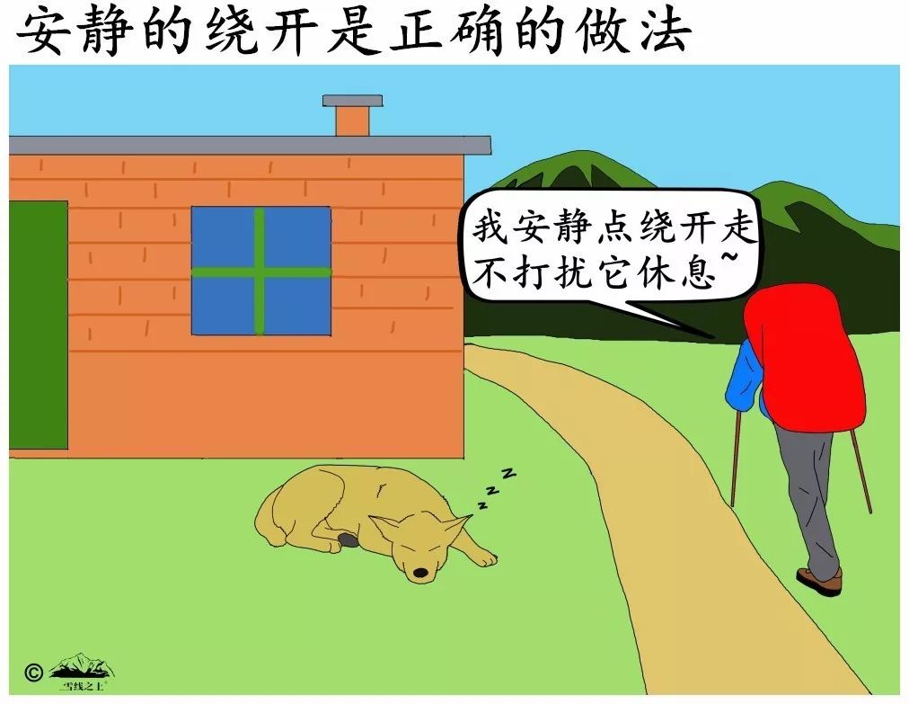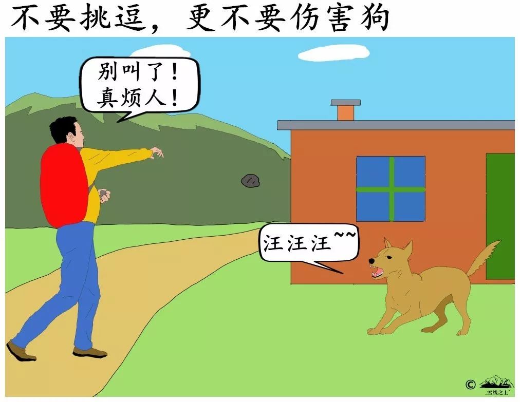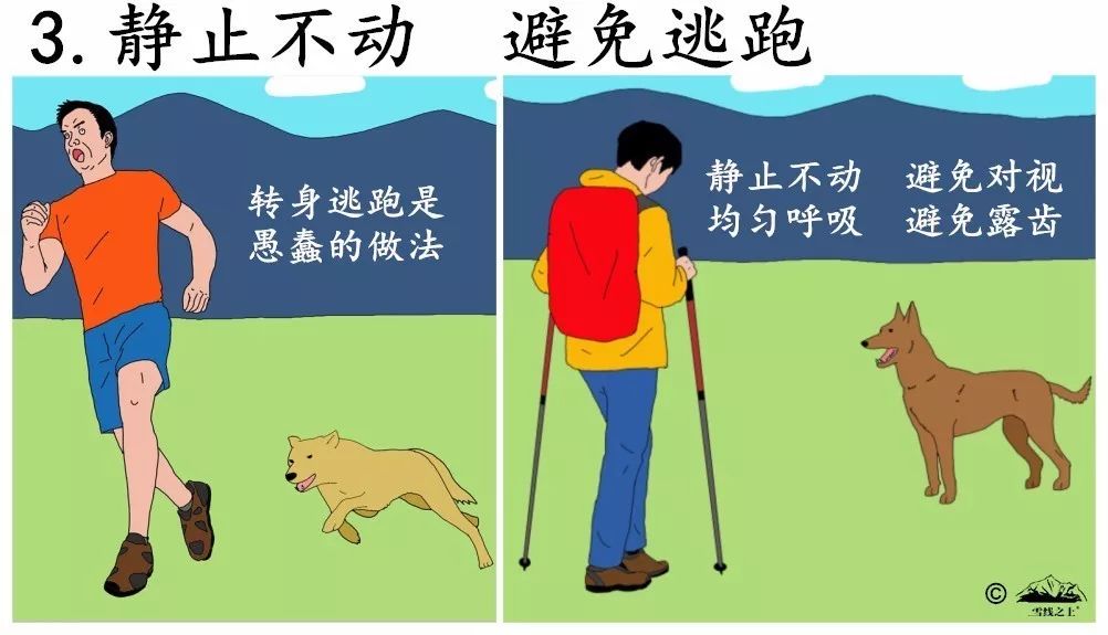 与狗遭遇,正确的做法是静止不动,低头看地。如果见狗就跑,狗就会把你当成猎物,本能地就去抓咬。