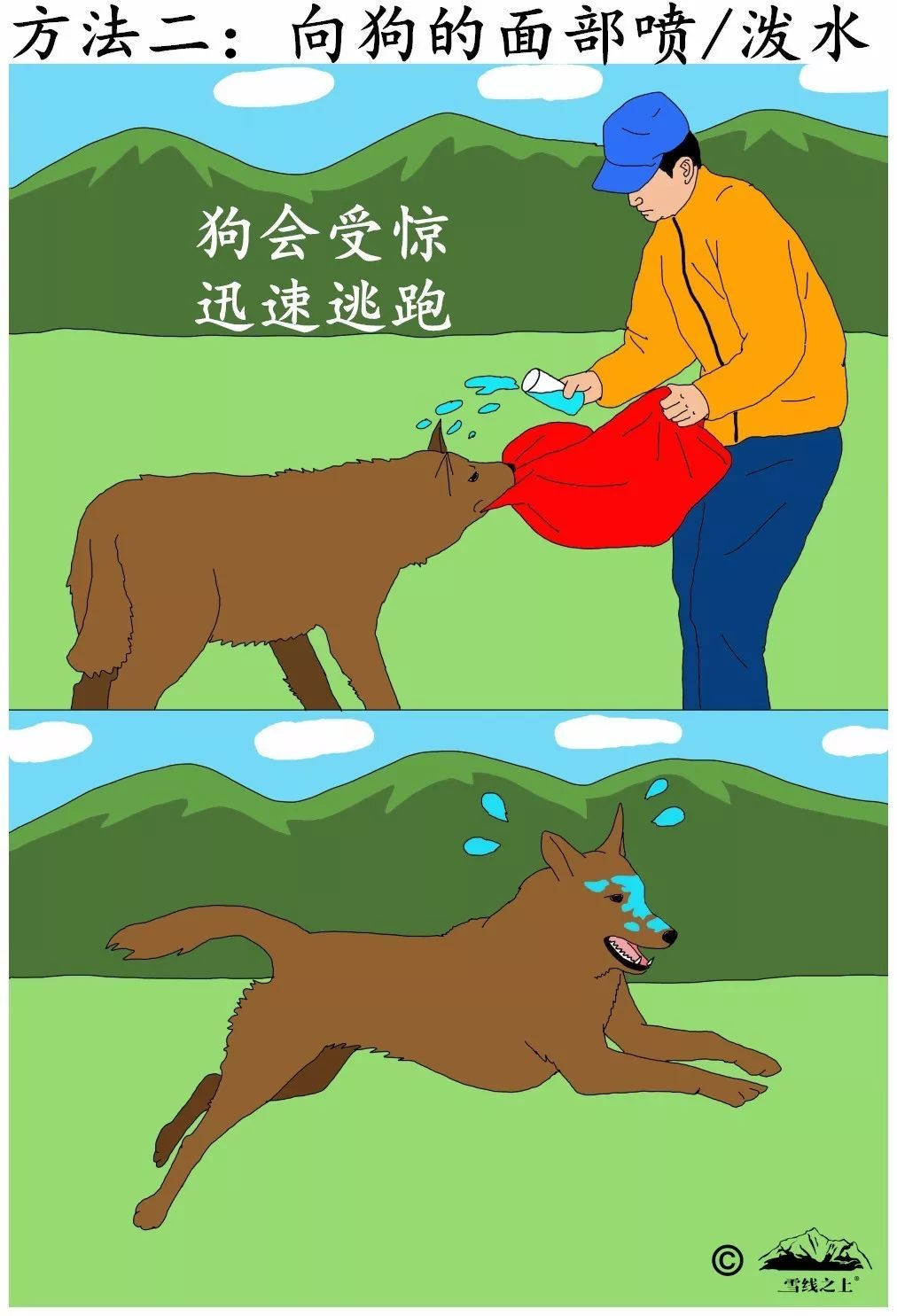 狗向你冲来时,可以使用带喷嘴的瓶子或直接用水瓶,朝狗的面部泼水。狗会受到惊吓,随即逃跑。