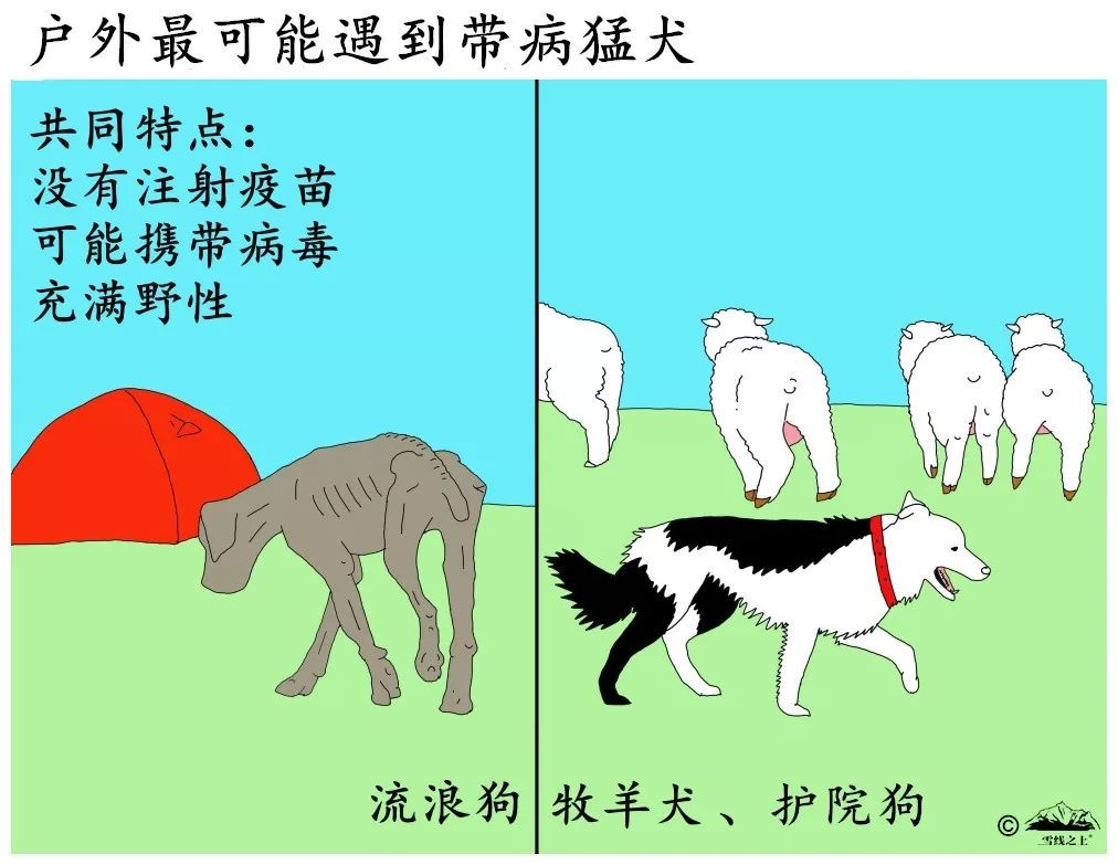 户外徒步中遇到的狗大多是流浪狗,或者为牧民、农户看家护院的狗,不同于城市的狗,它们充满野性,领地意识强烈,也很可能没有注射过狂犬病疫苗。