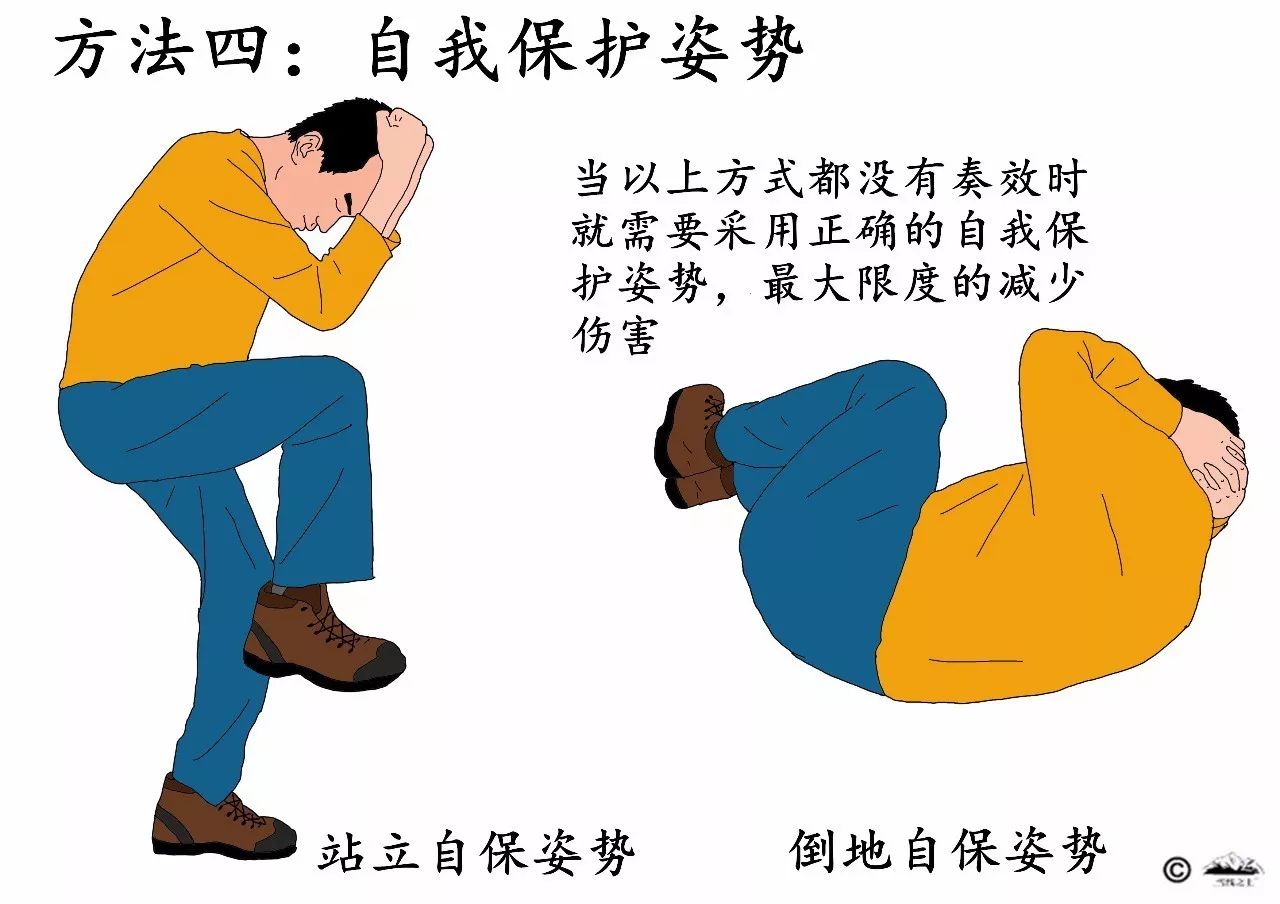 站立时,用双臂护住面部,将一个膝盖抬起至胸前,可以有效地保护腹部。如果不慎绊倒,迅速蜷缩在一起,双手抱头,盖住颈部和耳朵。