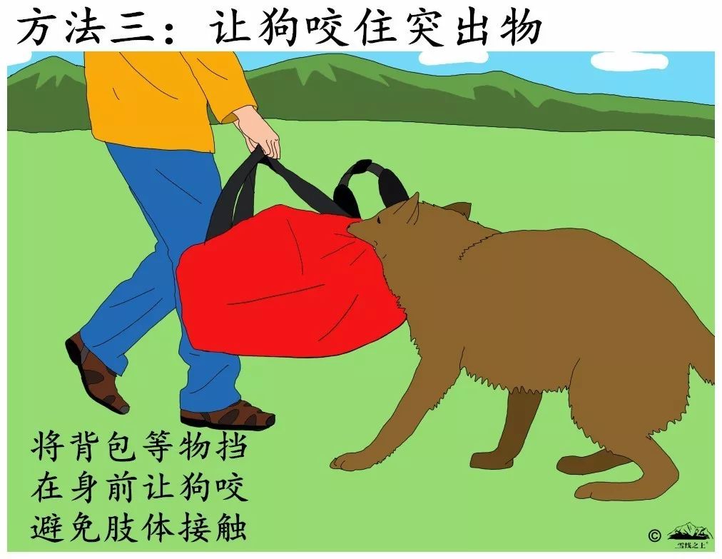 当狗的扑咬已经无法避免时,将背包、衣物等挡在自己身前,让狗咬住,尽可能地减少肢体上的接触。狗会率先攻击突出的部位。