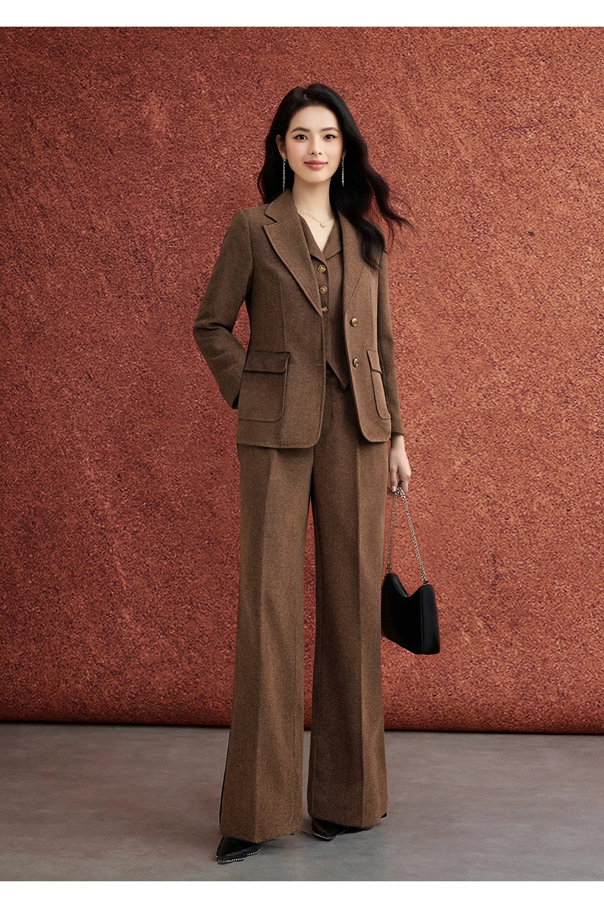 自带肌理感的羊毛材质,抗皱又挺括,不用费心打理也能保持利落版型;厚度刚好适配秋冬,内搭高领衫保暖不臃肿,室外套大衣、室内单穿都能打