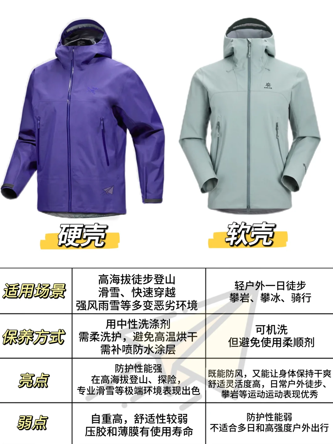 软壳(Softshell)和硬壳(Hardshell)是户外常见的两种外套类型。