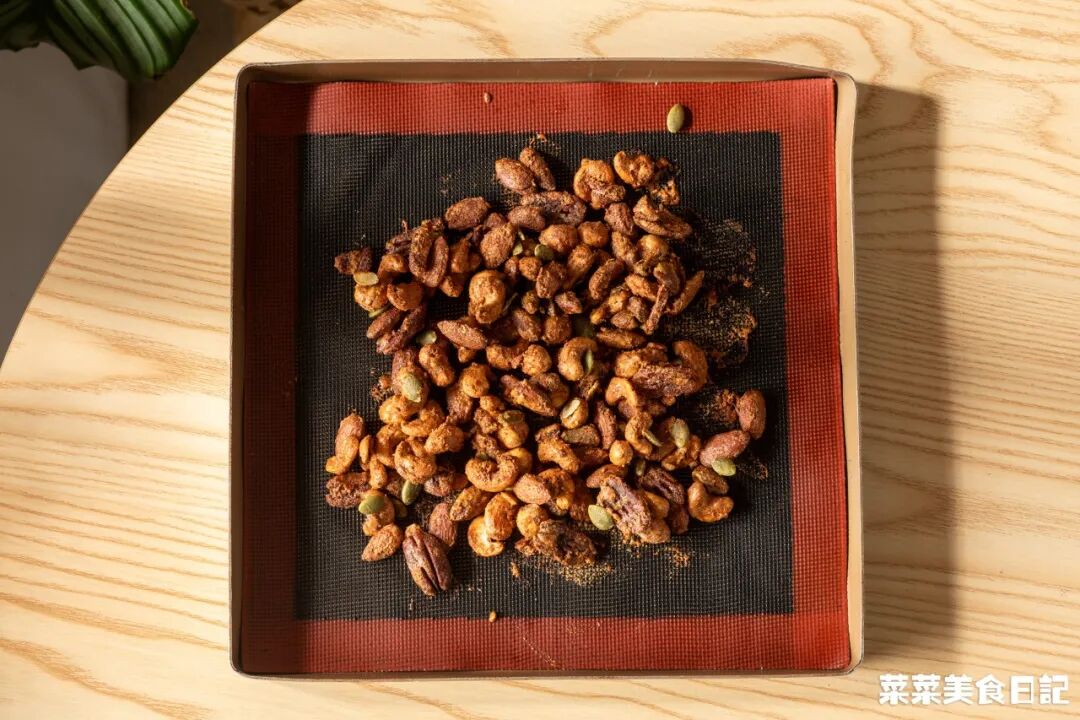 每隔15分钟翻一次面,让坚果均匀上色,低温烤没那么热气,高温烤更加香脆