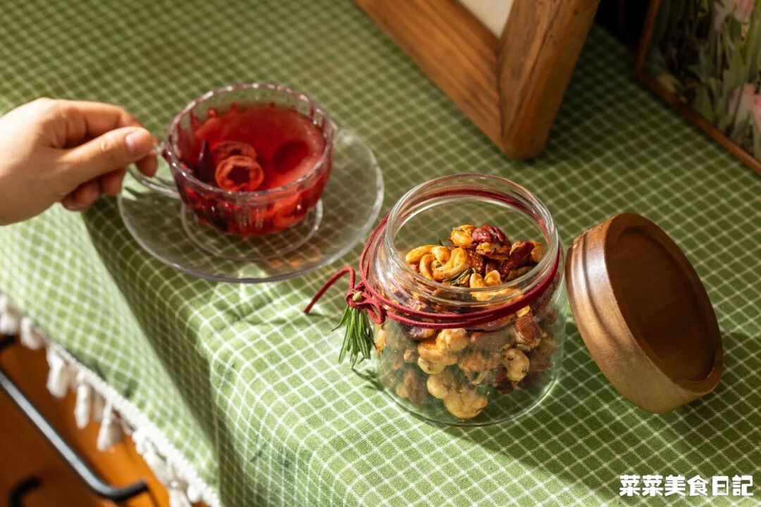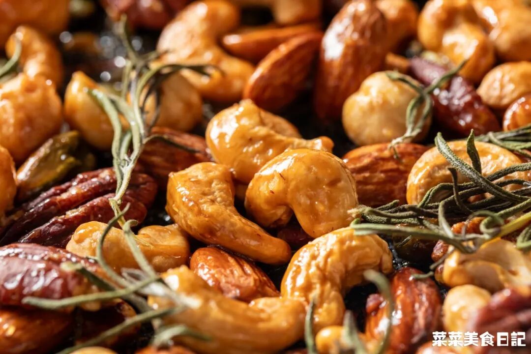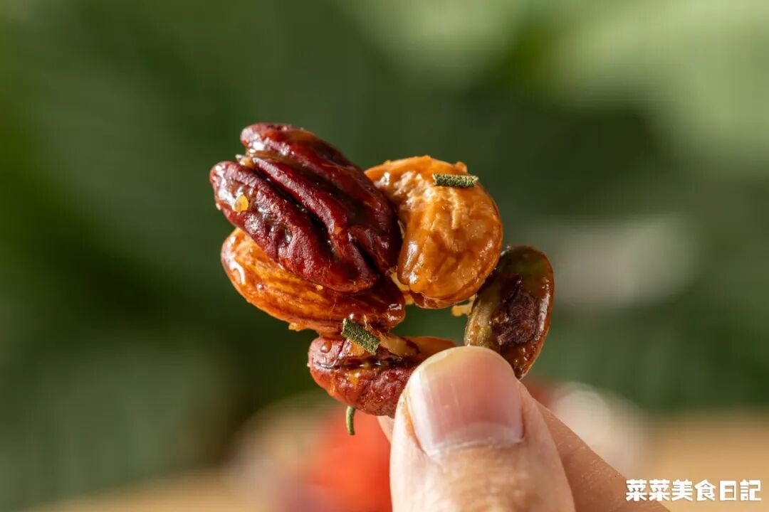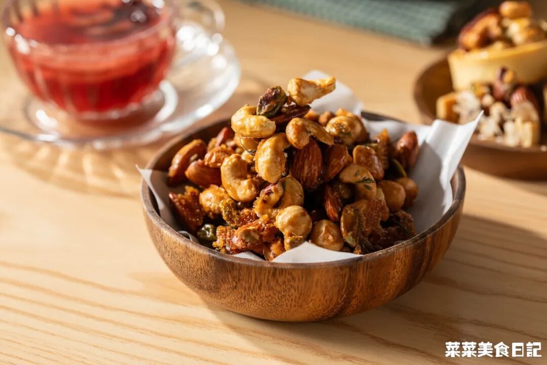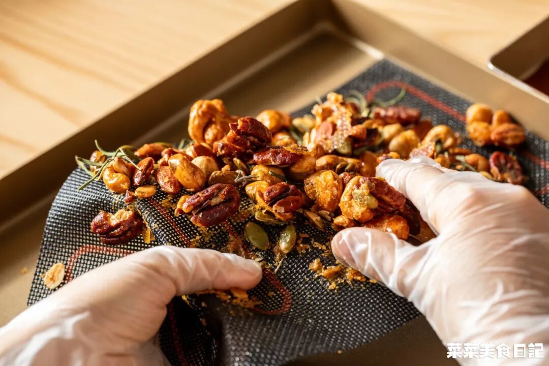 原味坚果150g 枫糖/蜂蜜30g 细砂糖5g 盐0.5g 黄油8g 迷迭香2g
