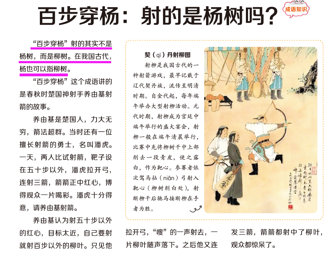 第6-7版是课文相关的各类语文基础知识拓展,包括课文中涉及的、考试中要考的字词、成语、古诗文、文学文化常识等,各类语文必备知识点,进行趣味解读、无痛学习,孩子不用死记硬背,每期读一读、看一看,就能很好地理解掌握。比如,我们所熟知的成语“百步穿杨”,其实射中的柳树哦。