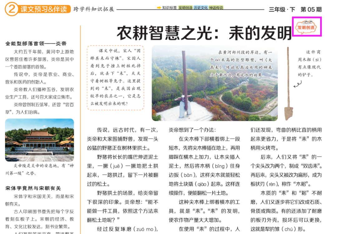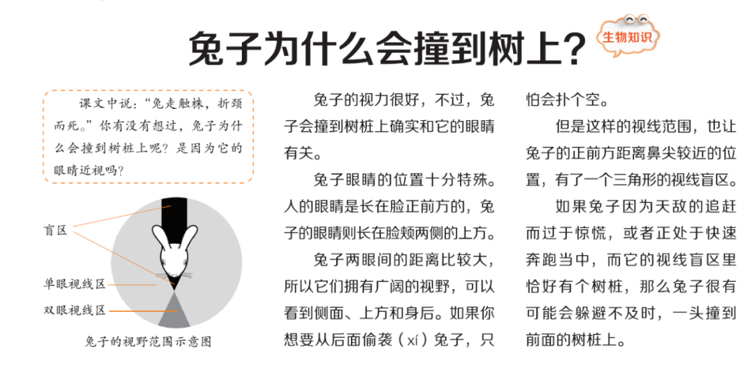 ·“同步课本,一期一课”:完全同步部编版语文教材,比如,学完三年级第5课的《守株待兔》,画报就带孩子探索寓言背后的历史知识、古代农耕技术等发明创造,兔子为什么会撞树上等生物知识,十二生肖卯兔传统文化知识等,内容非常丰富 。