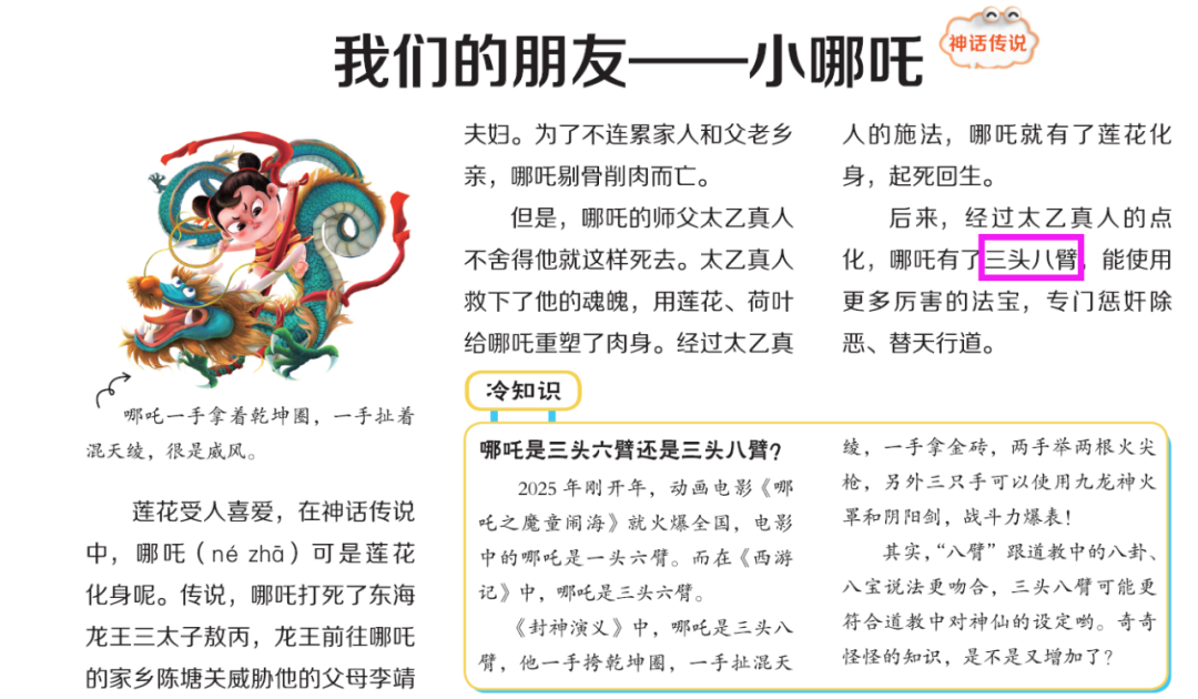 比如,从《荷花》这一课,延伸到开年即爆火的国漫之光动画电影——《哪吒2魔童闹海》(因为哪吒在剔骨削肉而亡后,师父太乙真人用莲藕为其重塑了肉身),中间对哪吒到底是三头六臂还是三头八臂这一冷知识进行了科普。对于很多看过该电影的孩子来说,这个话题非常有意思,具有探讨性。