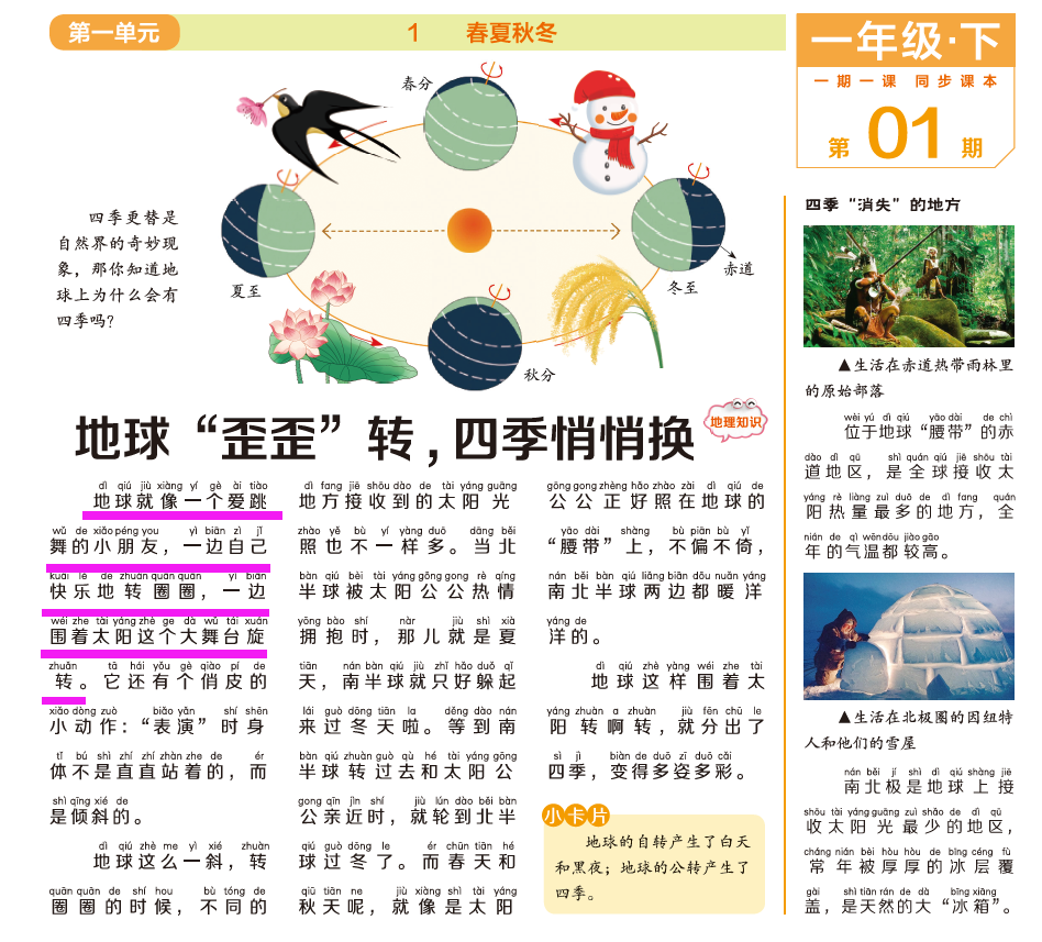 o低年级:全文注音+趣味插图,用低年级孩子便于理解的语言讲解知识。比如,当讲到春夏秋冬时,就把地球比作一个爱跳舞的小朋友在转圈圈,文字极富童趣。