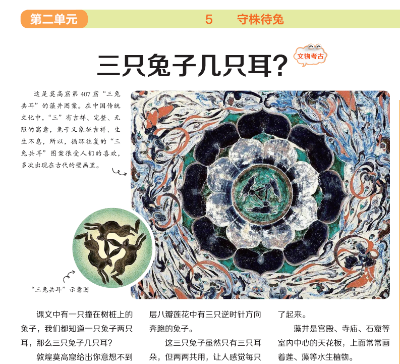 第1版是围绕课文主题的头版文章,用有趣的知识话题和阅读内容,吸引孩子对每一课的学习兴趣,引导孩子进入新课预习。例如《守株待兔》一课,头版以“三只兔子几只耳?”为题,以莫高窟“三兔共耳”的经典画面切入,一下子就激起了孩子的探索欲和求知欲;