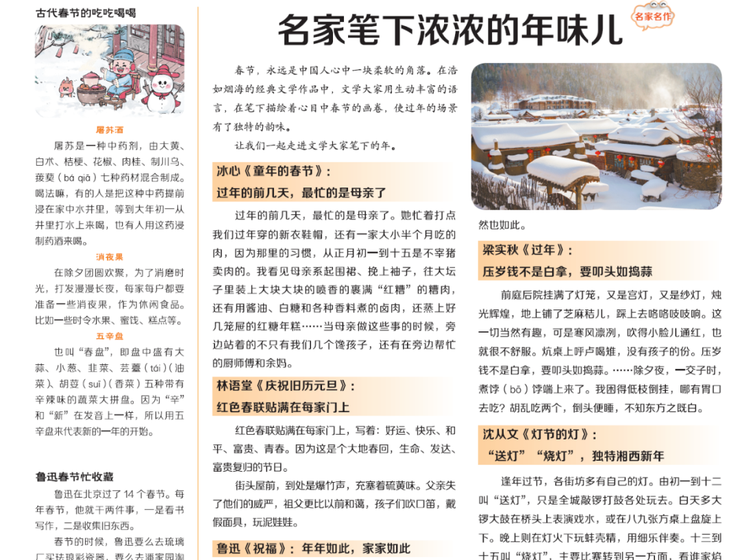比如,学完《北京的春节》后,可以阅读更多名家对春节的描述,比如冰心、林语堂、鲁迅笔下的春节,又各有什么特色,通过学习写作手法,积累高级词汇,让孩子从“凑字数”进阶到“下笔如有神”。