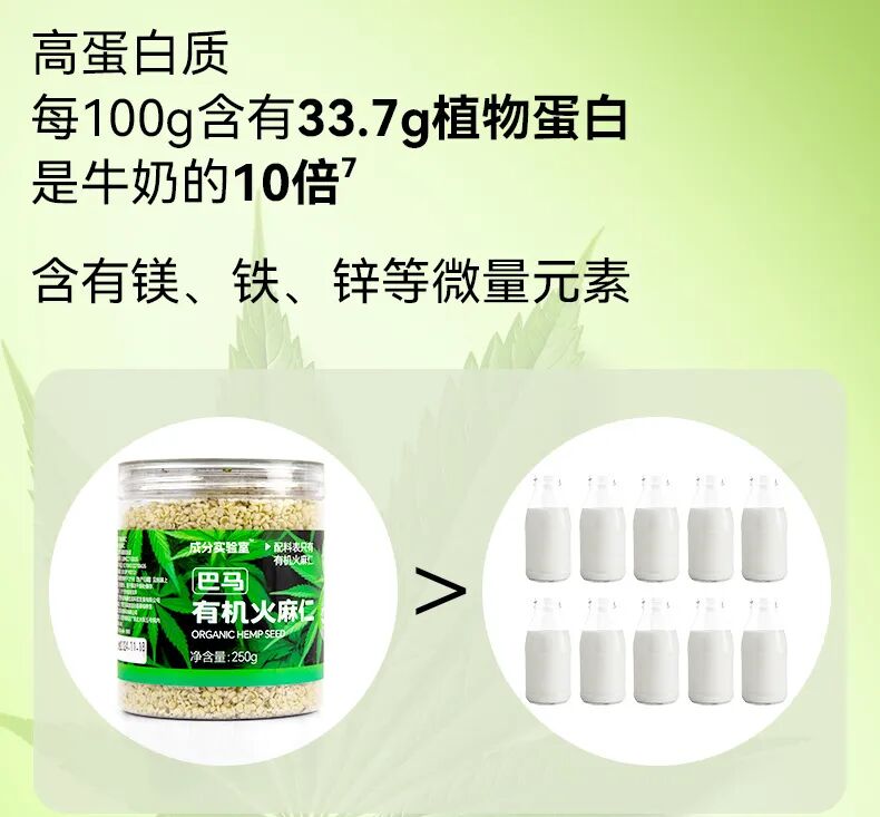 每100克火麻仁蛋白质含量33.7克(是牛奶的10倍),膳食纤维4.7克(是苹果的2.8倍),镁元素614毫克(是香蕉的19倍+),钾1302毫克(是西兰花的4倍多),而且包含所有必需氨基酸,弥补中老年人胃口差、牙口不好、吸收弱的营养缺口,为康健不老打下坚实的基础。