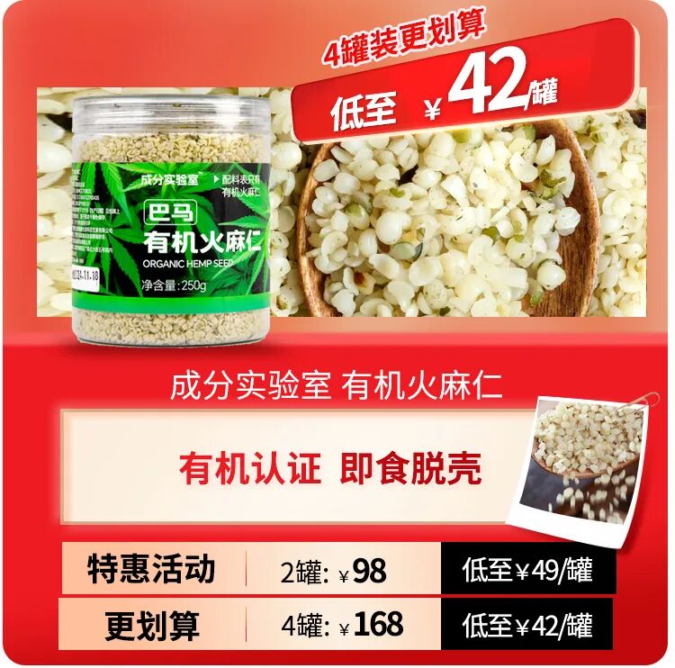 现在正是火麻仁应季成熟、营养饱满的时节,我们亲赴巴马核心产区,为大家找来这款成分实验室有.机火麻仁,并谈下了产地优惠:2罐(2月量)98元,4罐(4月量)168元,低到42元/罐!颗粒饱满,开罐即食,轻松把巴马人的智慧融入一日三餐。